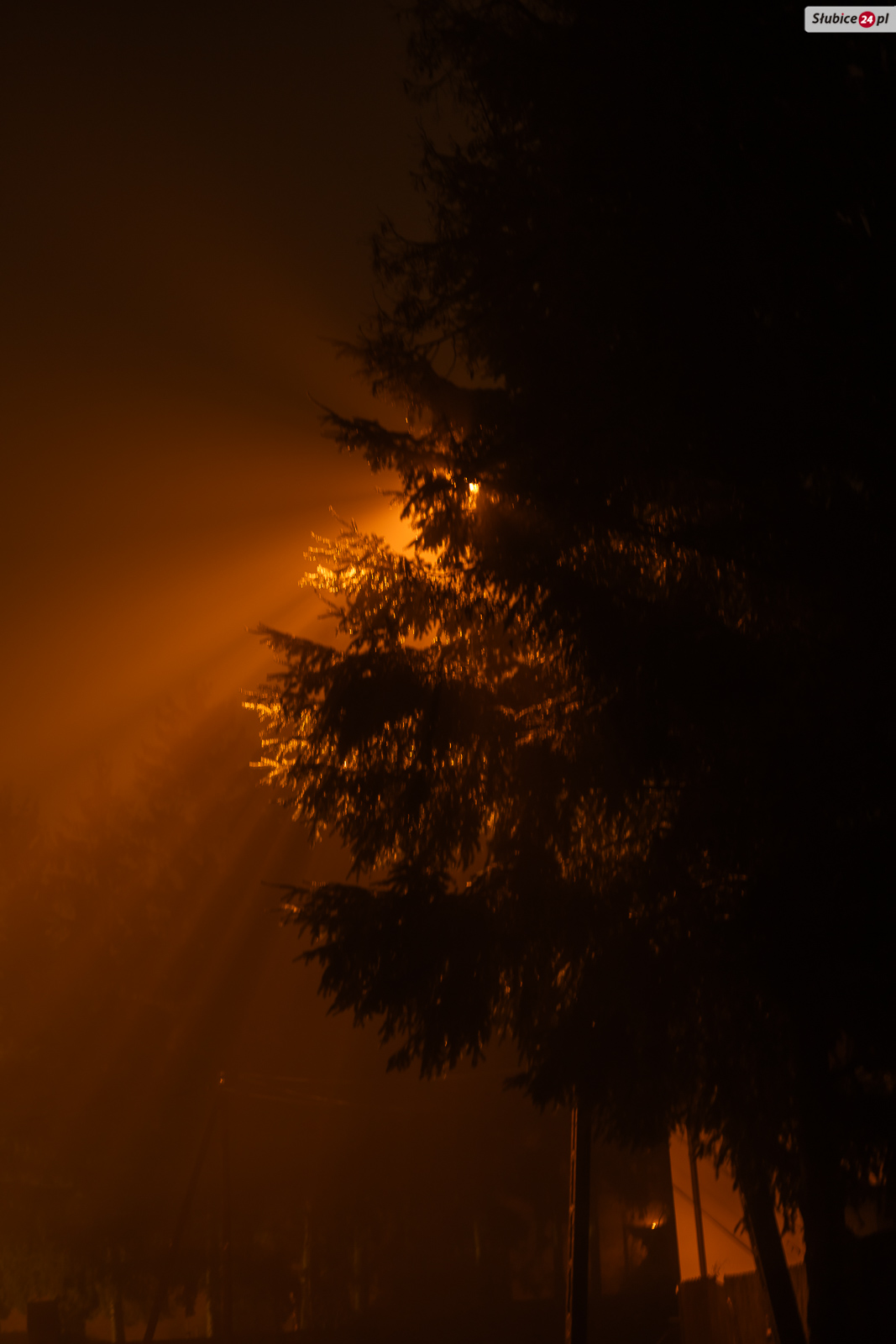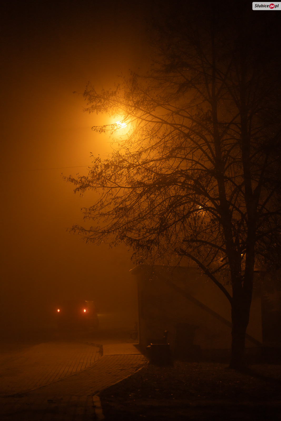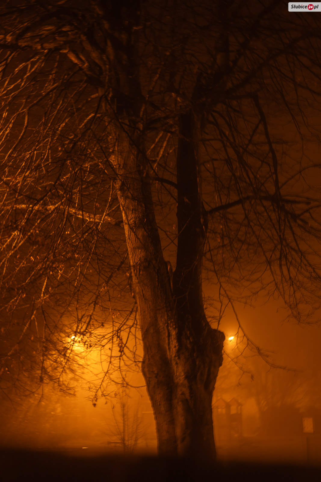 Tym razem odwiedziła Lubiechnię Wielką, gdzie tuż po zmroku mgła spowiła wiejskie uliczki i drzewa. A to wszystko oświetlone pomarańczowym światłem latarni.