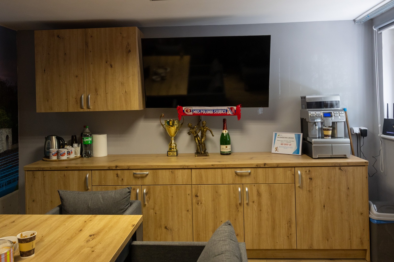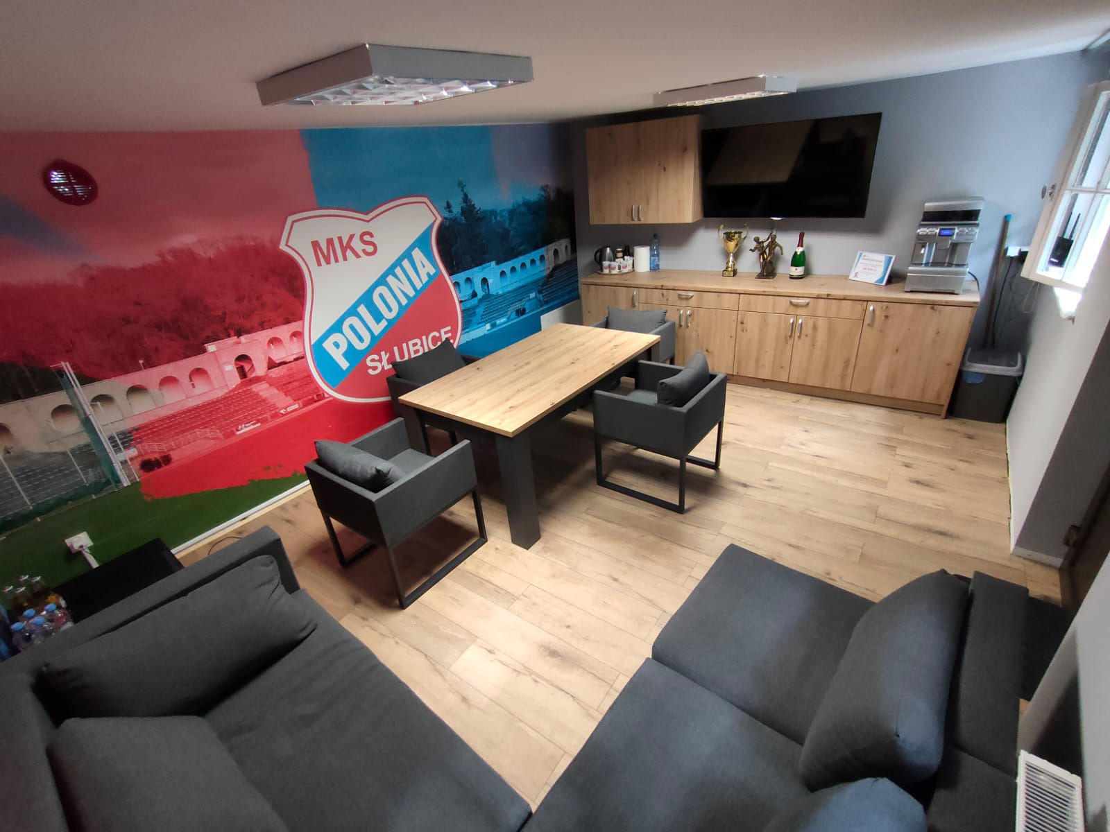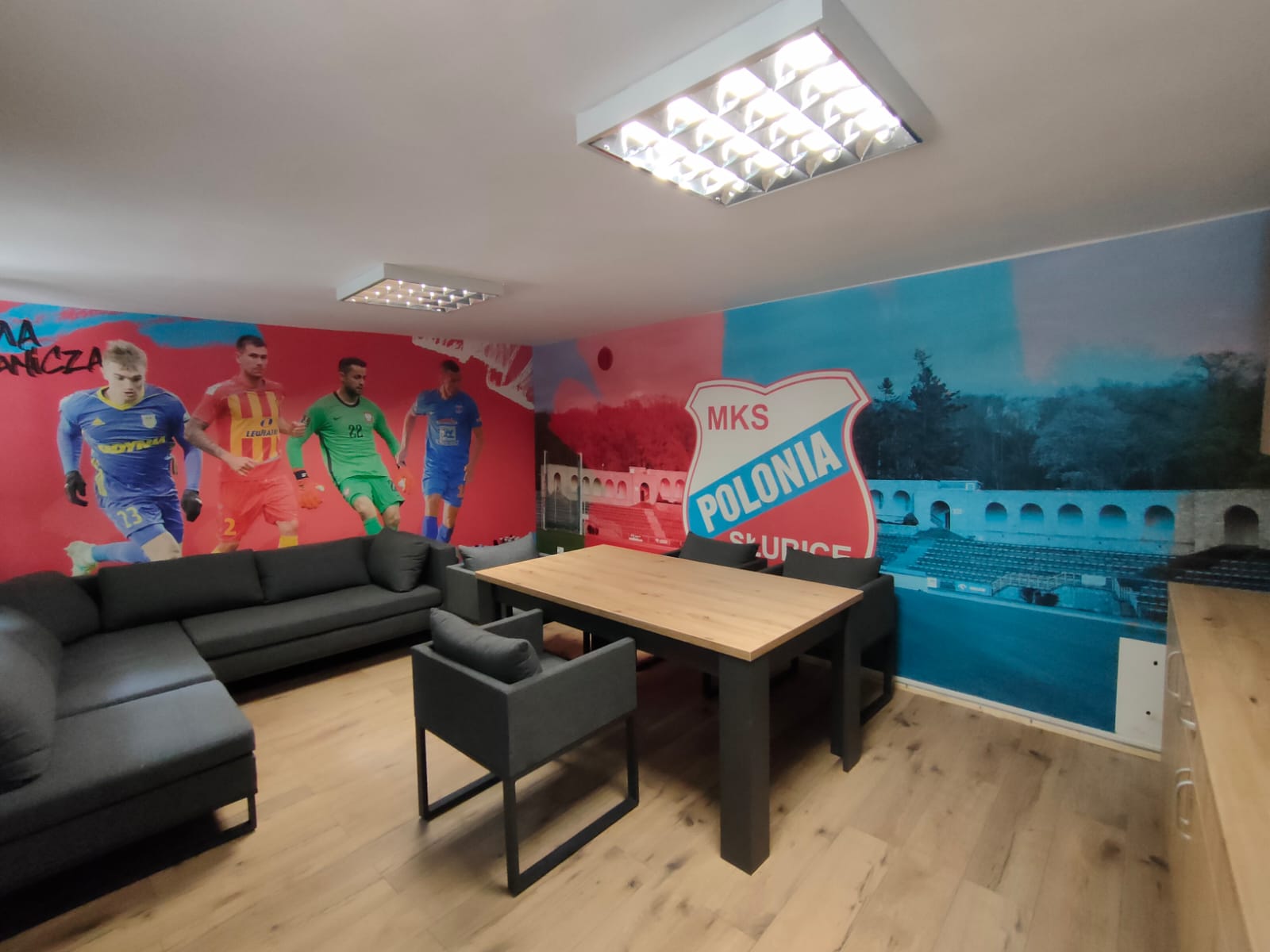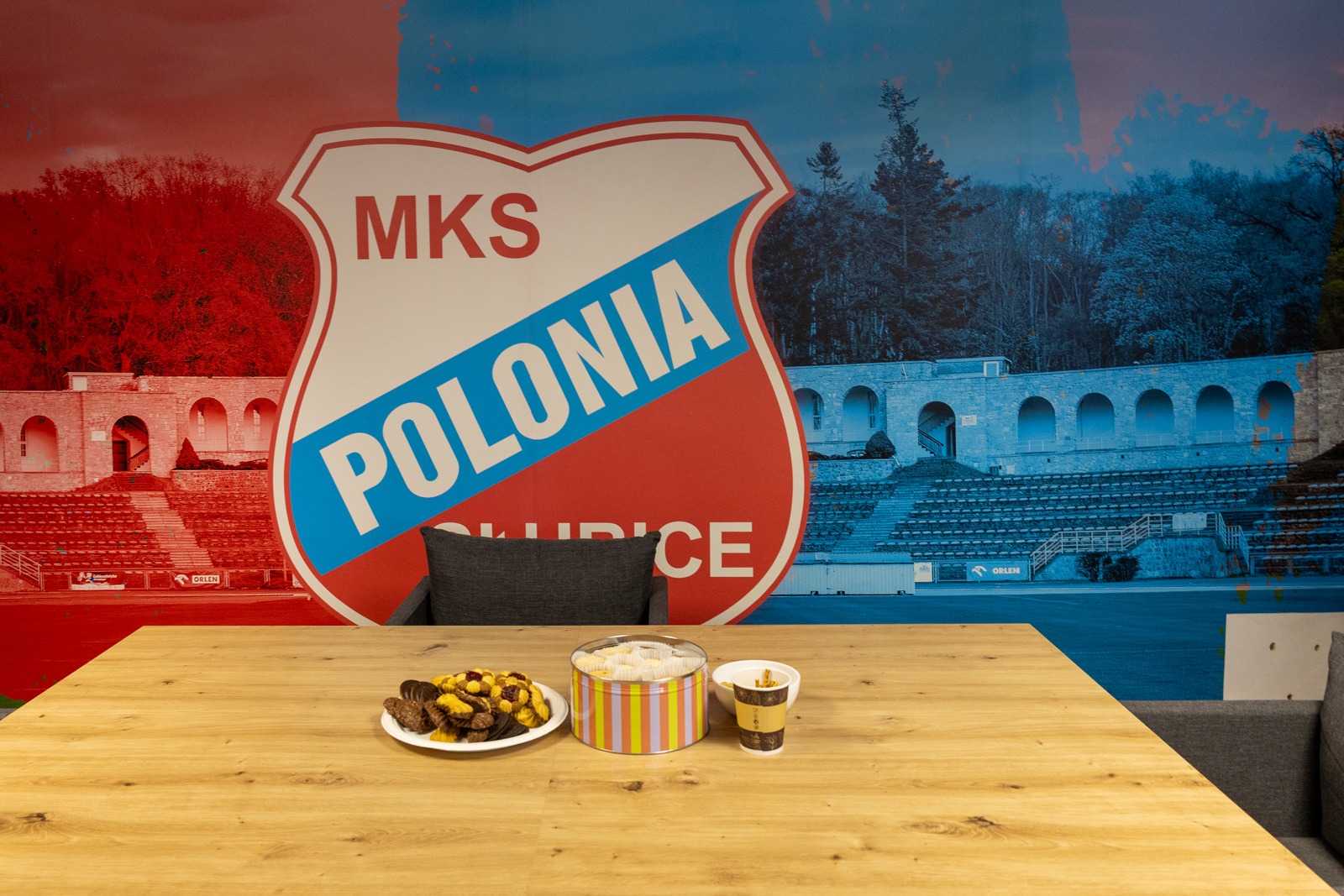 Klimatu dodają także klubowe gadżety, jak kubki z logo Polonii, szalik, okazały herb klubu oraz duże zdjęcia zabytkowego stadionu, na którym Polonia Słubice rozgrywa swoje mecze.