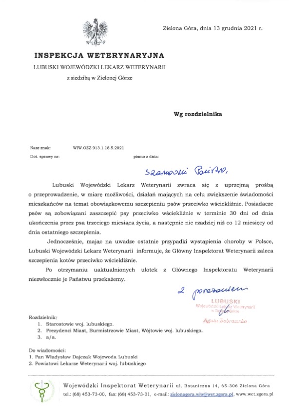 - Posiadacze psów są zobowiązani zaszczepić psy przeciwko wściekliźnie w terminie do 30 dni od dnia ukończenia przez psa trzeciego miesiąca życia, a następnie nie rzadziej niż co 12 miesięcy od dnia ostatniego szczepienia – czytamy w piśmie rozesłanym przez inspekcję weterynaryjną.