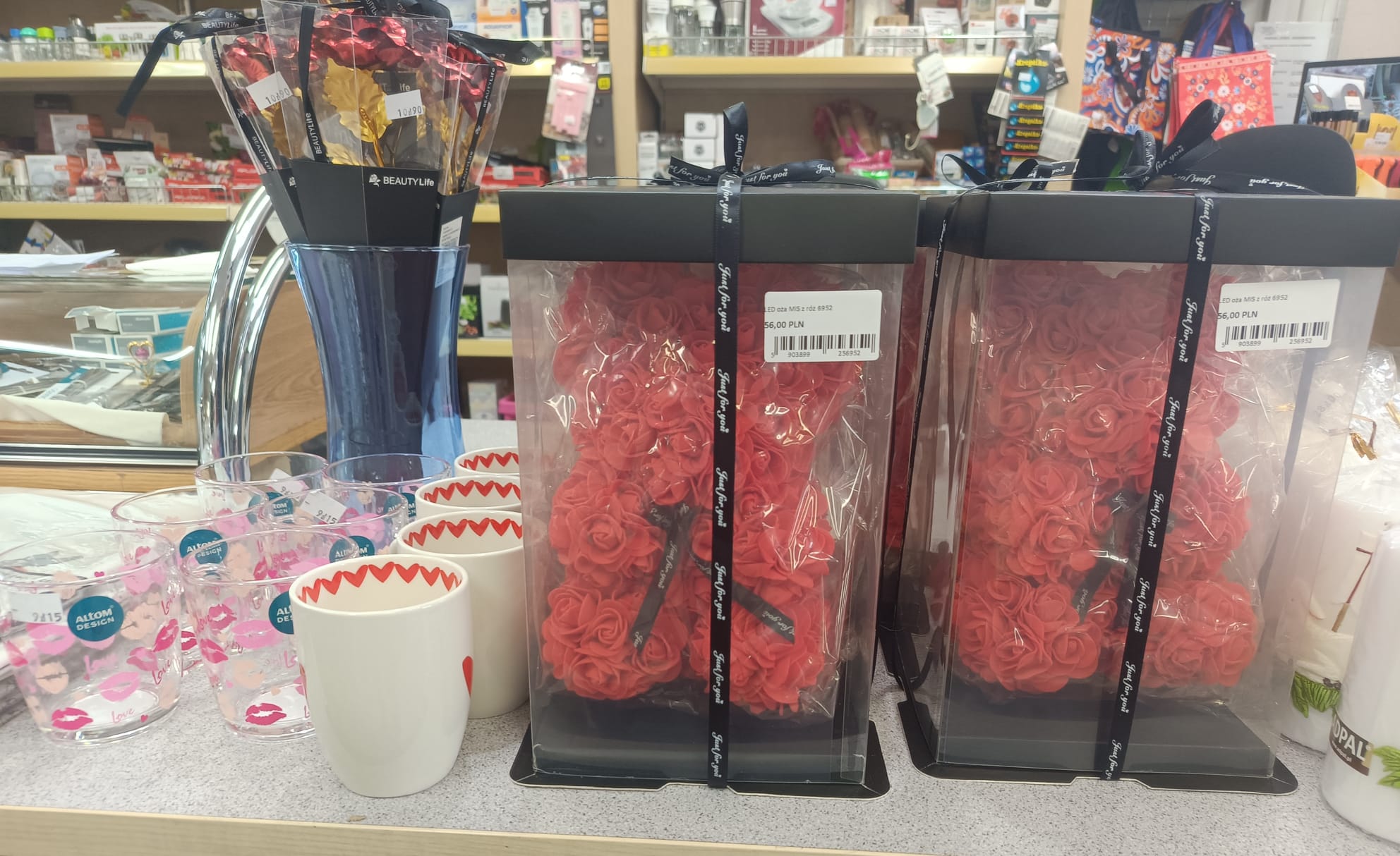 Szukasz prezentu na walentynki? Odwiedź sklep Merkury w Słubicach, gdzie znajdziesz wiele pomysłów na ciekawe podarunki. W ofercie m.in. czerwony miś z róż piankowych zapakowany w pudełko prezentowe, kubki, szklanki i wiele innych.