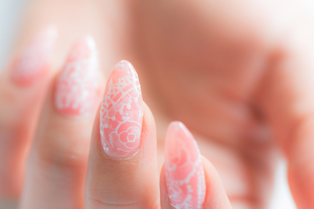 Koronki – idealnym uzupełnieniem weselnej kreacji z koronkami będą paznokcie z tym samym motywem. Jeśli to manicure dla panny młodej, najlepiej wykonać go w kolorystyce bladego różu i bieli.