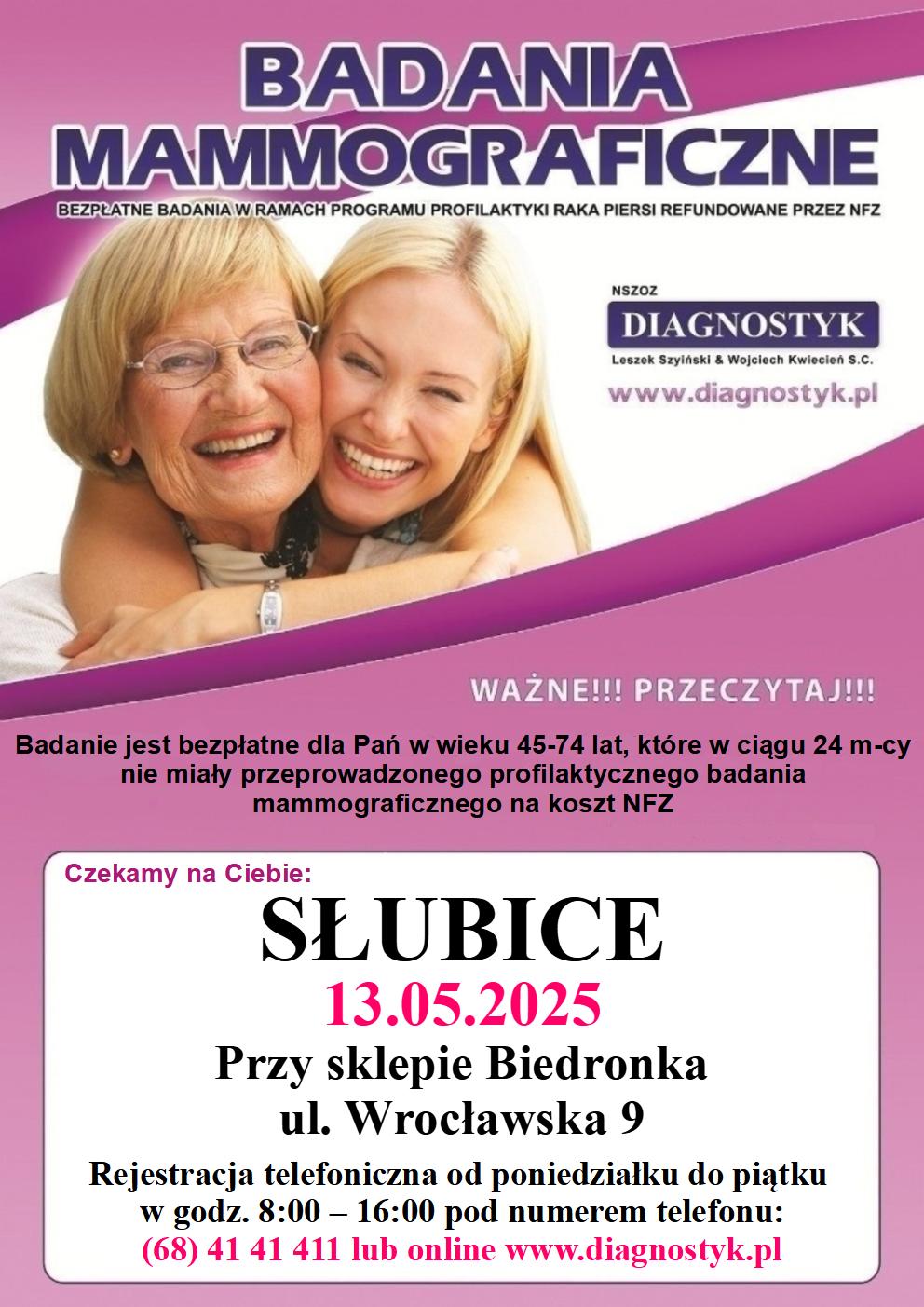 13 maja w Słubicach będzie można skorzystać z bezpłatnych badań piersi, czyli tzw. mammografii. Mammobus podstawiony zostanie przy sklepie Biedronka na ul. Wrocławskiej 9. Badania realizowane są w ramach programu profilaktyki raka piersi finansowanego przez Narodowy Fundusz Zdrowia.