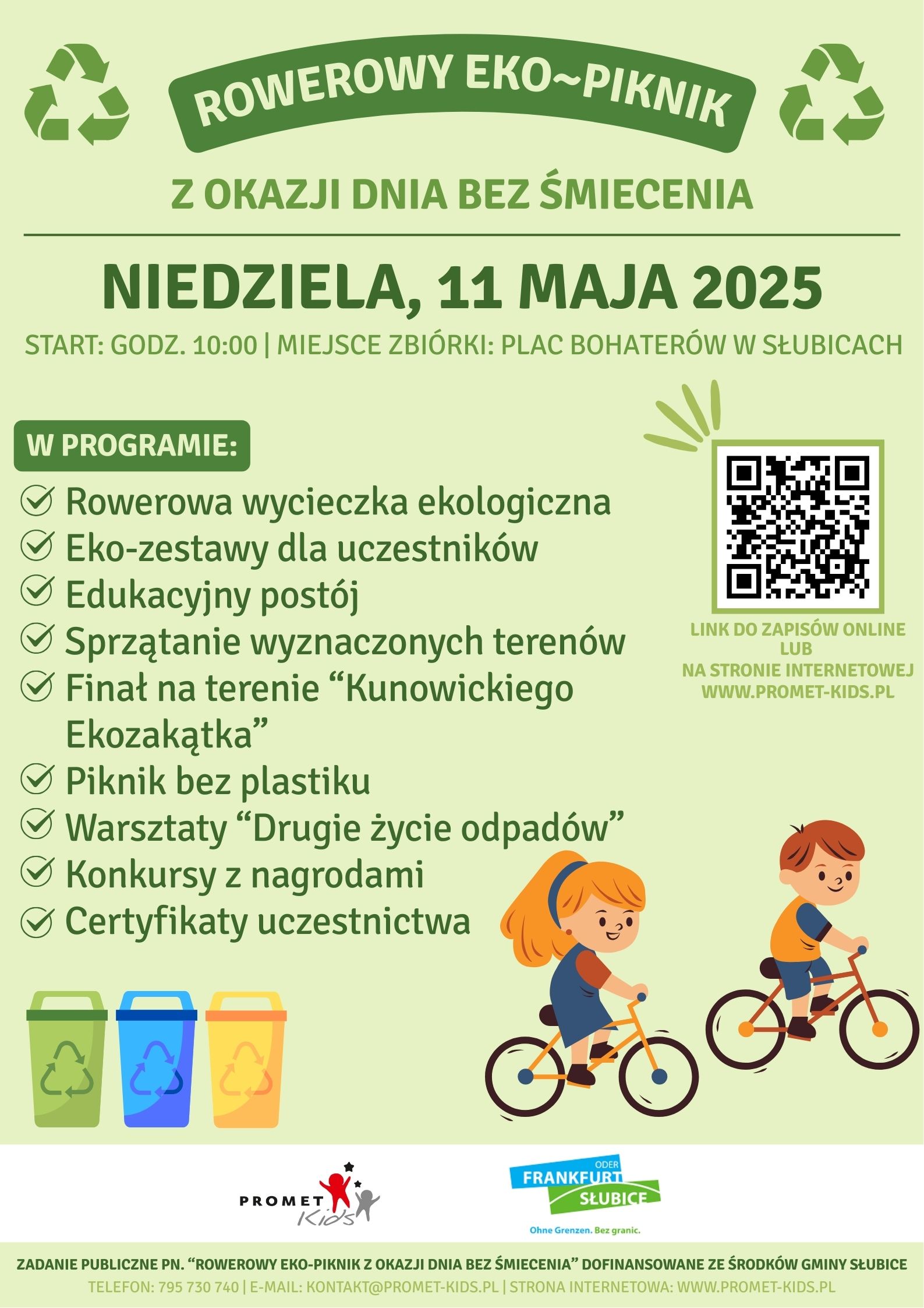 Fundacja Promet Kids serdecznie zaprasza mieszkańców Gminy Słubice oraz okolic na Rowerowy Eko-Piknik, który odbędzie się w niedzielę, 11 maja 2025 r. Wydarzenie organizowane jest z okazji Dnia Bez Śmiecenia i ma na celu promowanie postaw proekologicznych oraz budowanie świadomości w zakresie ochrony środowiska naturalnego.