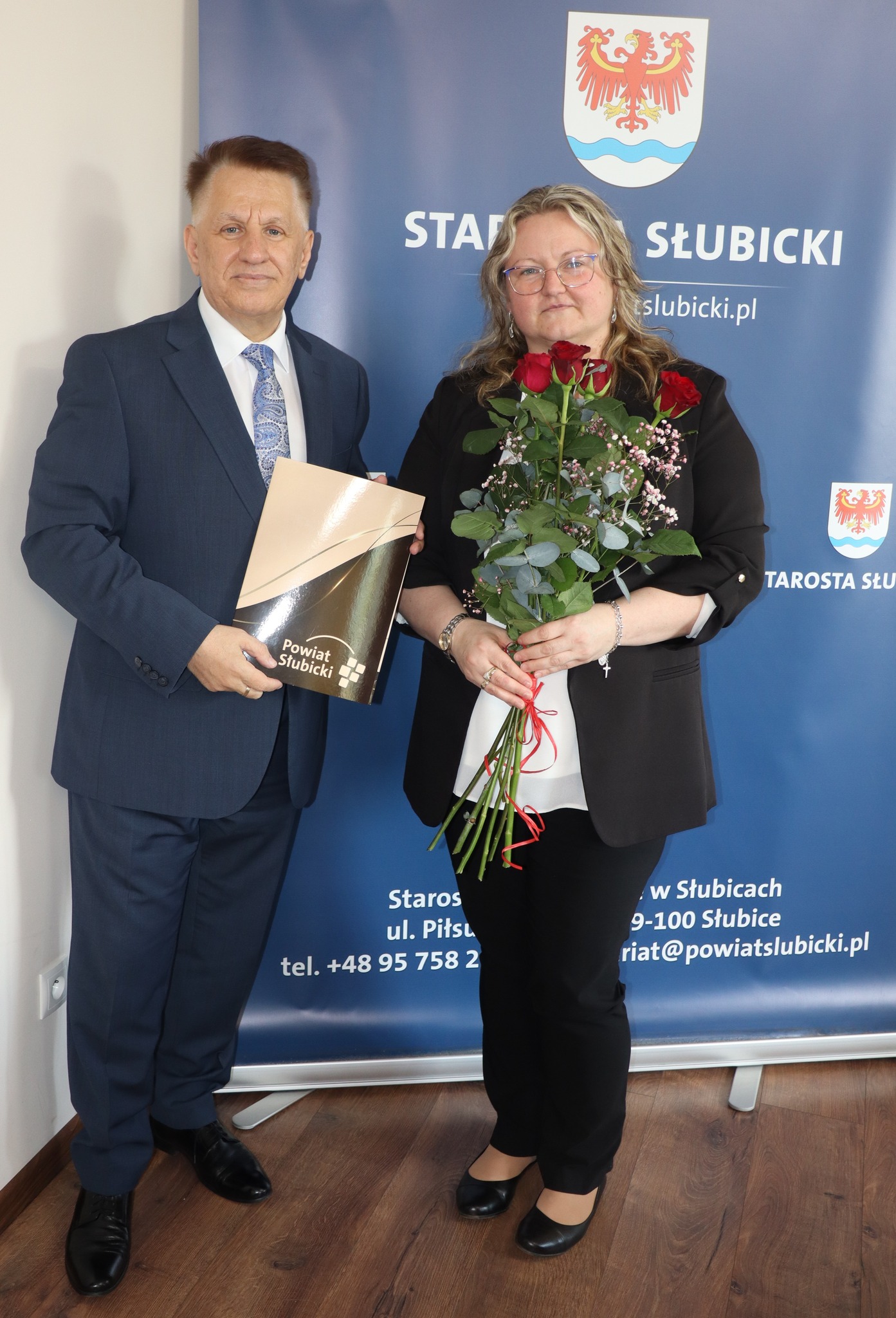 Marta Markiewicz – obecna dyrektorka Zespołu Szkół Licealnych w Słubicach – obchodzi 20-lecie pracy zawodowej. Z tej okazji gratulacje oraz nagrodę jubileuszową wręczył jej starosta słubicki Leszek Bajon.