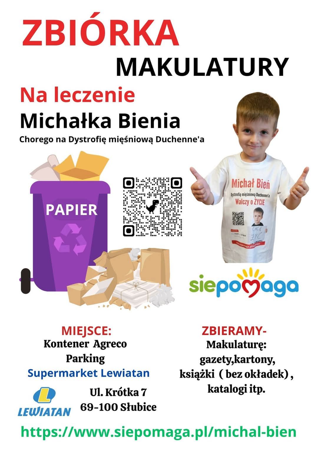 W Słubicach rusza kolejna forma wsparcia dla Michała Bienia chorego na dystrofię mięśniową Duchenne’a. 23 maja przy supermarkecie Lewiatan zostanie ustawiony kontener na makulaturę, z którego dochód zostanie przeznaczony na leczenie chłopca.