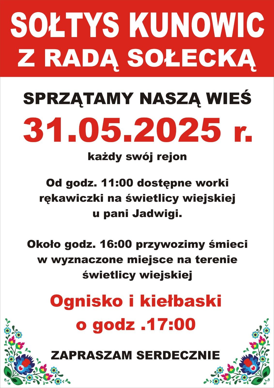 31 maja mieszkańcy Kunowic wezmą udział w akcji sprzątania swojej wsi. Wydarzenie organizowane przez sołtysa Pawła Sokołowskiego i radę sołecką ma na celu nie tylko poprawę estetyki otoczenia, ale także integrację lokalnej społeczności.