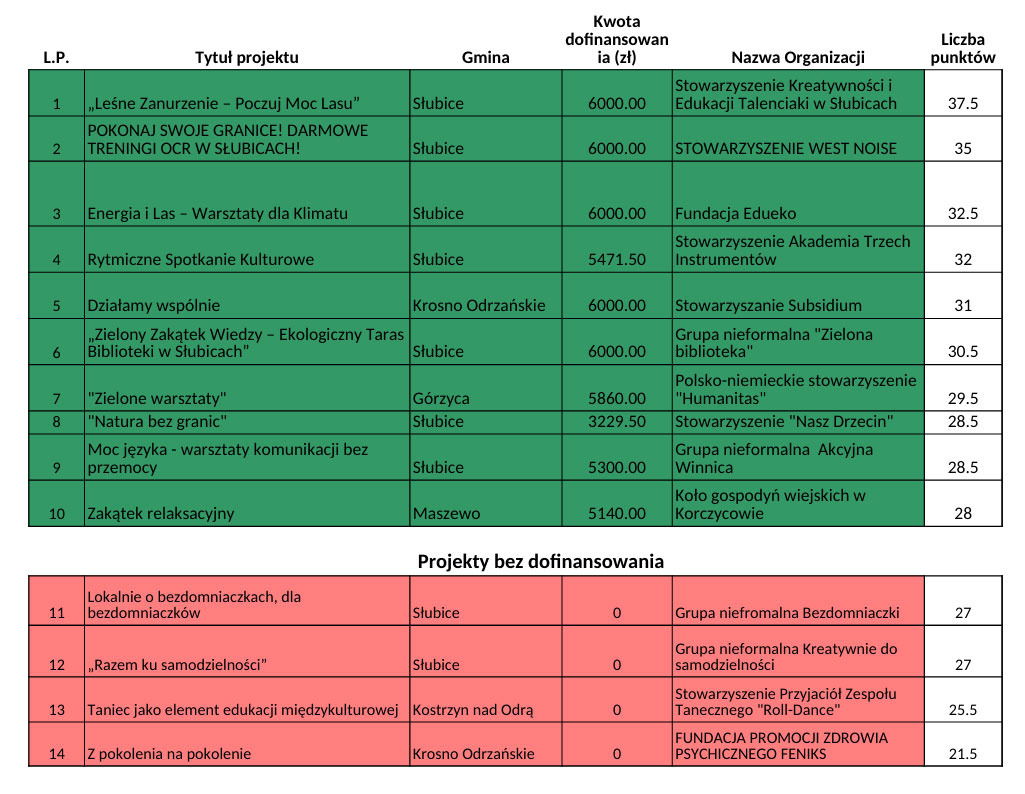 Na liście dofinansowanych projektów są również m.in. warsztaty klimatyczne Fundacji Edueko, rytmiczne spotkania kulturalne Akademii Trzech Instrumentów oraz ekologiczne działania w gminach Krosno Odrzańskie, Górzyca i Maszewo.