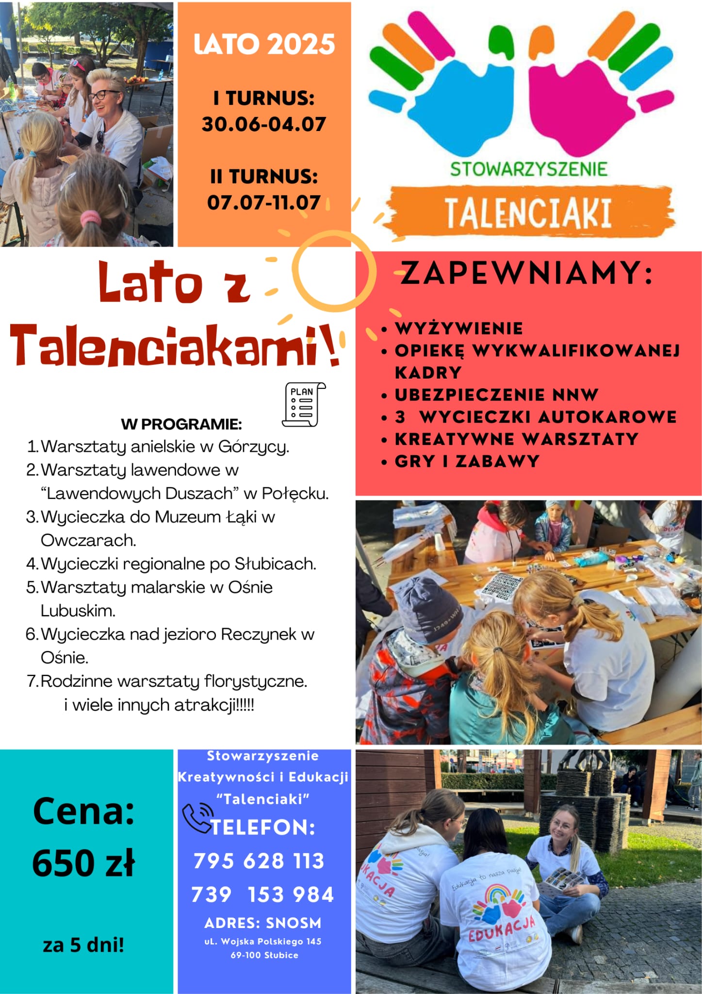 Stowarzyszenie Kreatywności i Edukacji Talenciaki zaprasza dzieci w wieku szkolnym na letnią przygodę pełną pasji, odkryć i dobrej zabawy, czyli najbardziej kreatywne półkolonie w Słubicach.