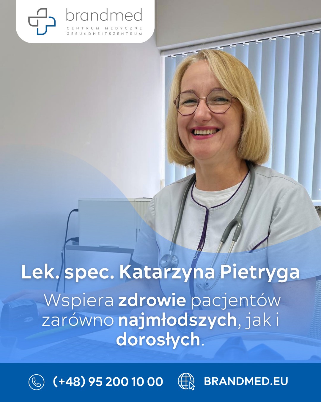 Lek. spec. Katarzyna Pietryga wspiera zdrowie pacjentów w Centrum Medycznym Brandmed - zarówno tych najmłodszych (bez ograniczeń wiekowych), jak i dorosłych. To doświadczona specjalistka medycyny rodzinnej, której możecie powierzyć zdrowie całej rodziny.