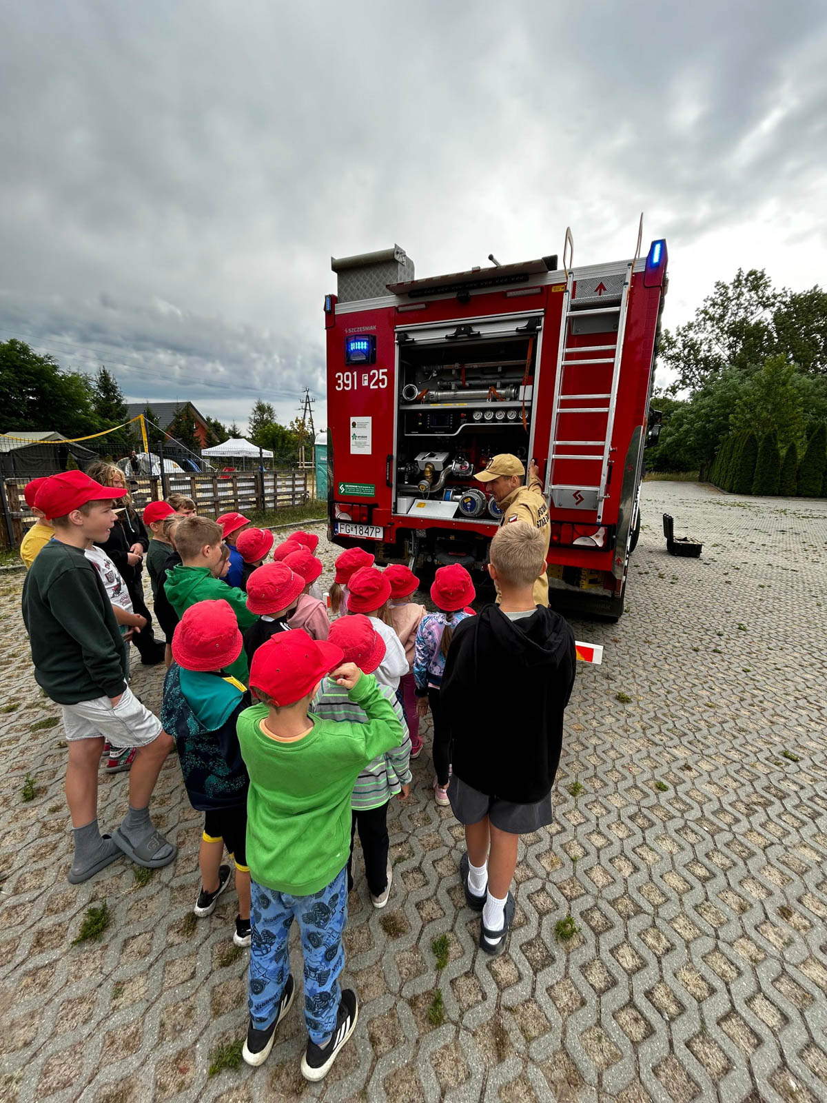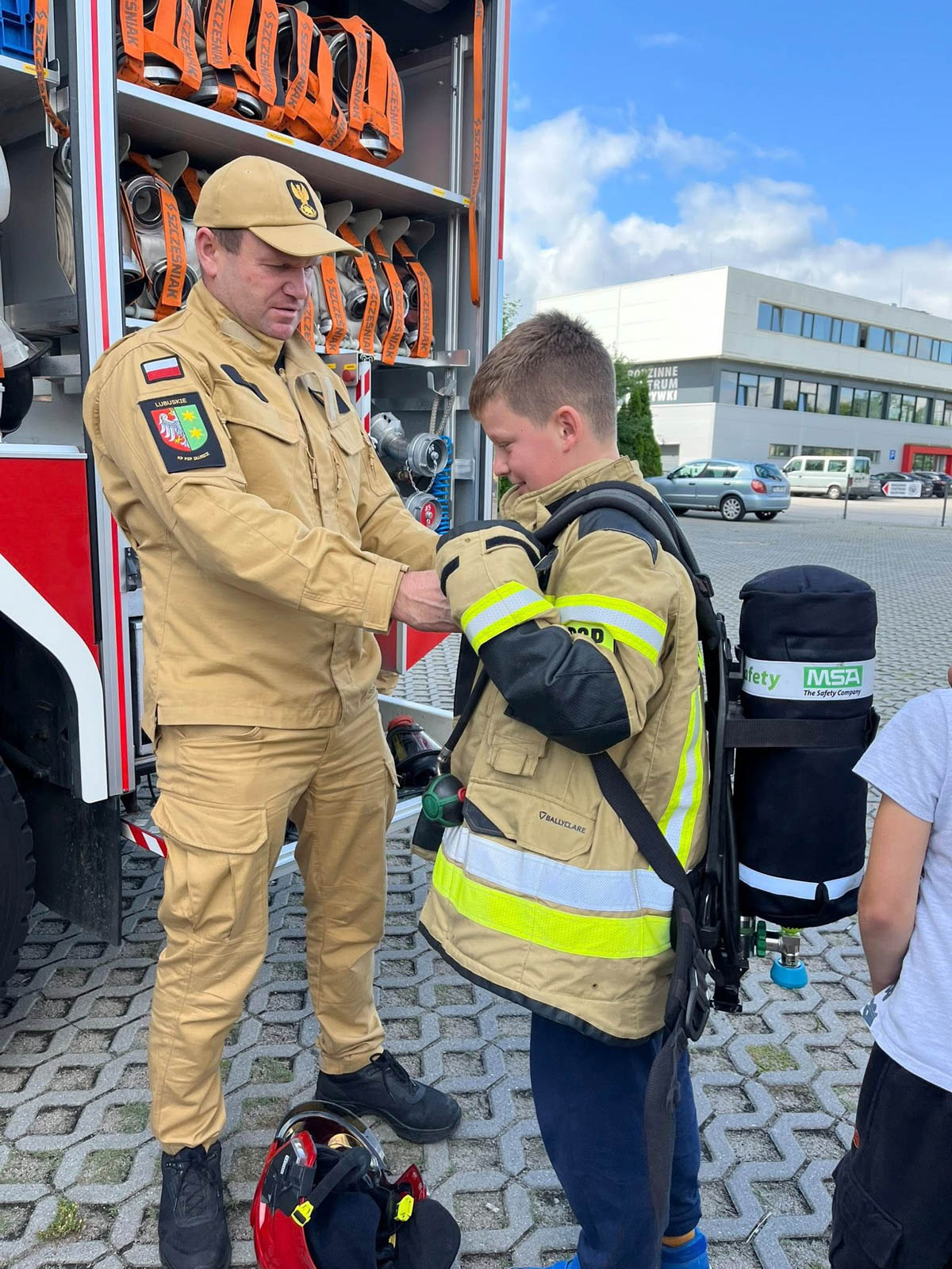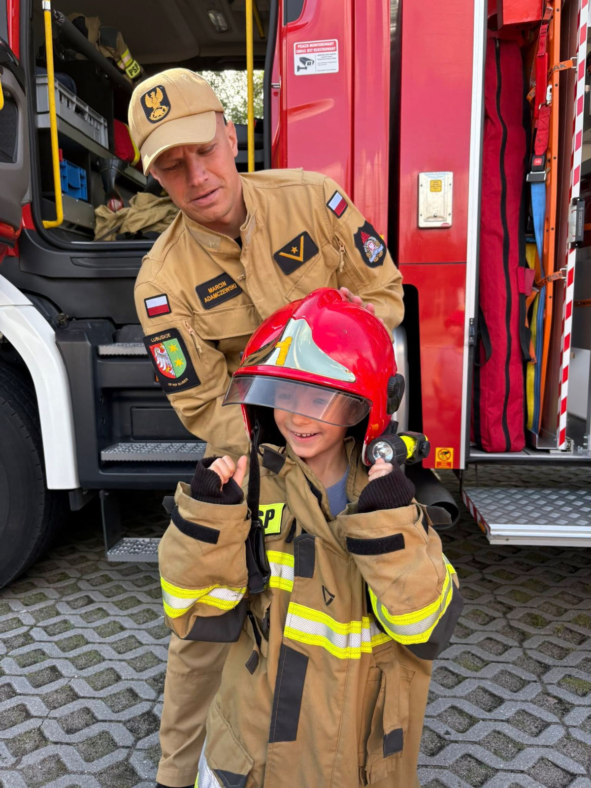 Nie zabrakło też praktyki – najmłodsi mogli przymierzyć strażackie stroje, wejść do wozu i spróbować swoich sił w gaszeniu „pożaru” z węża. Dla wielu była to pierwsza tak bliska styczność ze służbą ratowniczą.