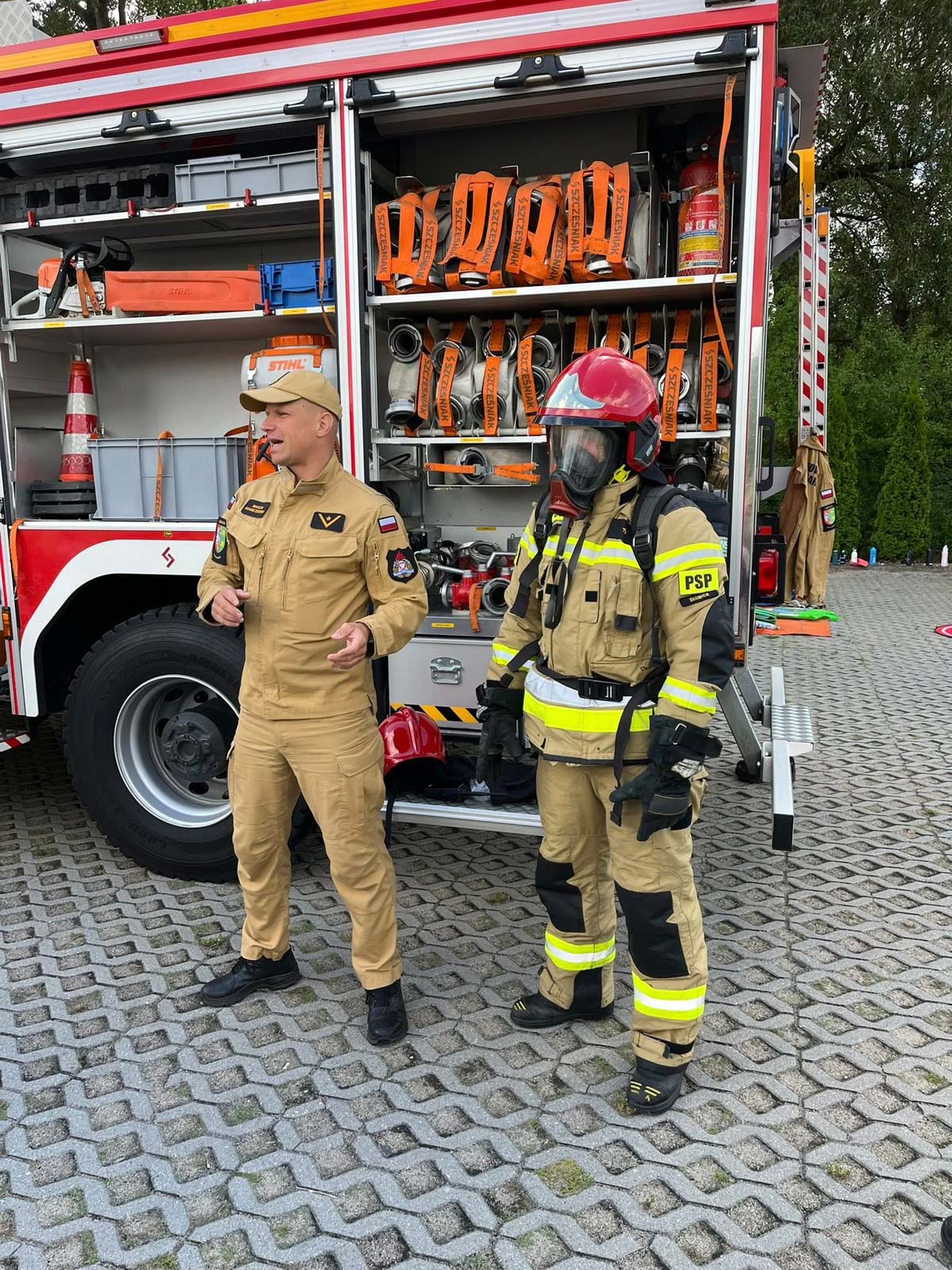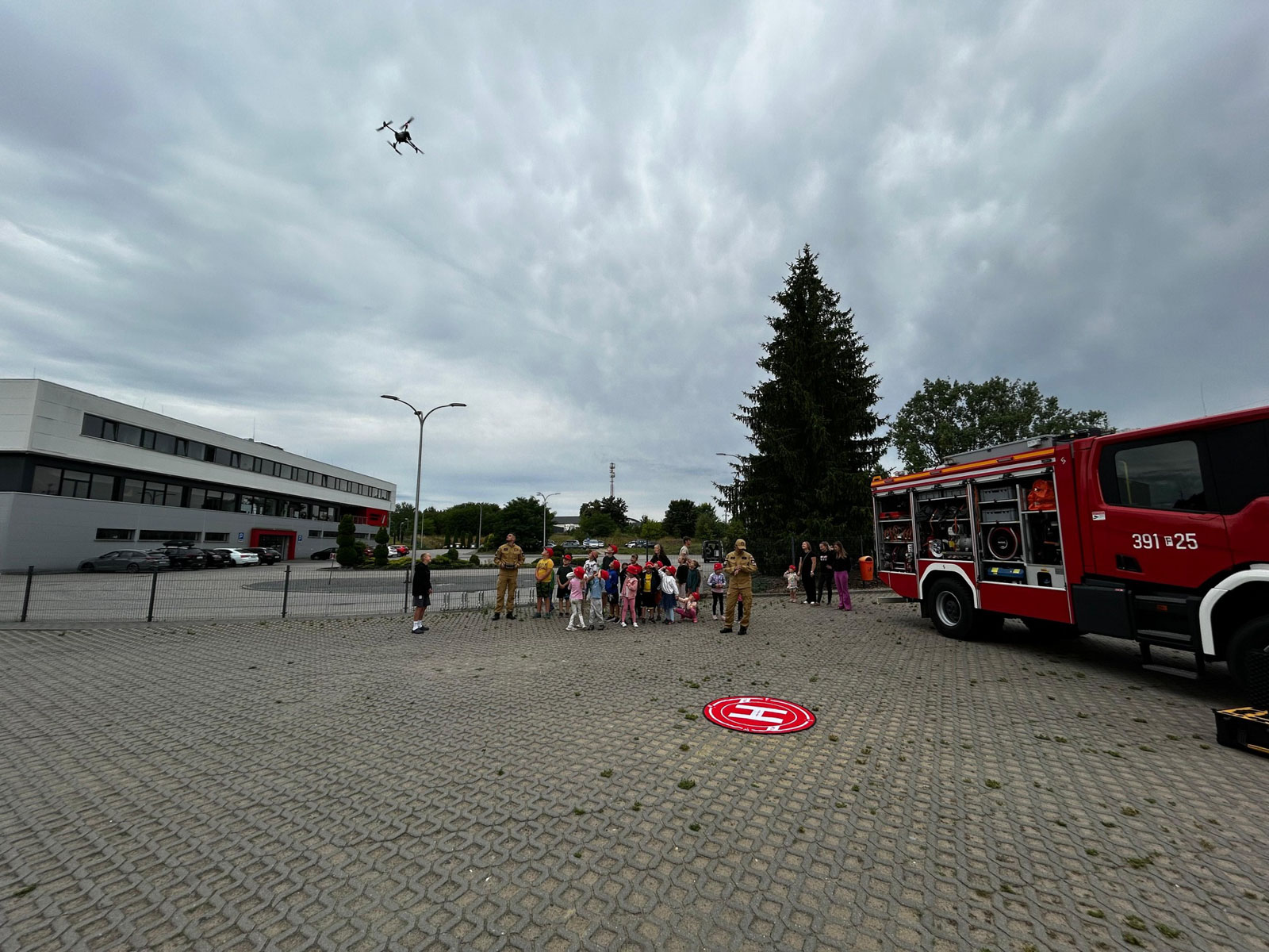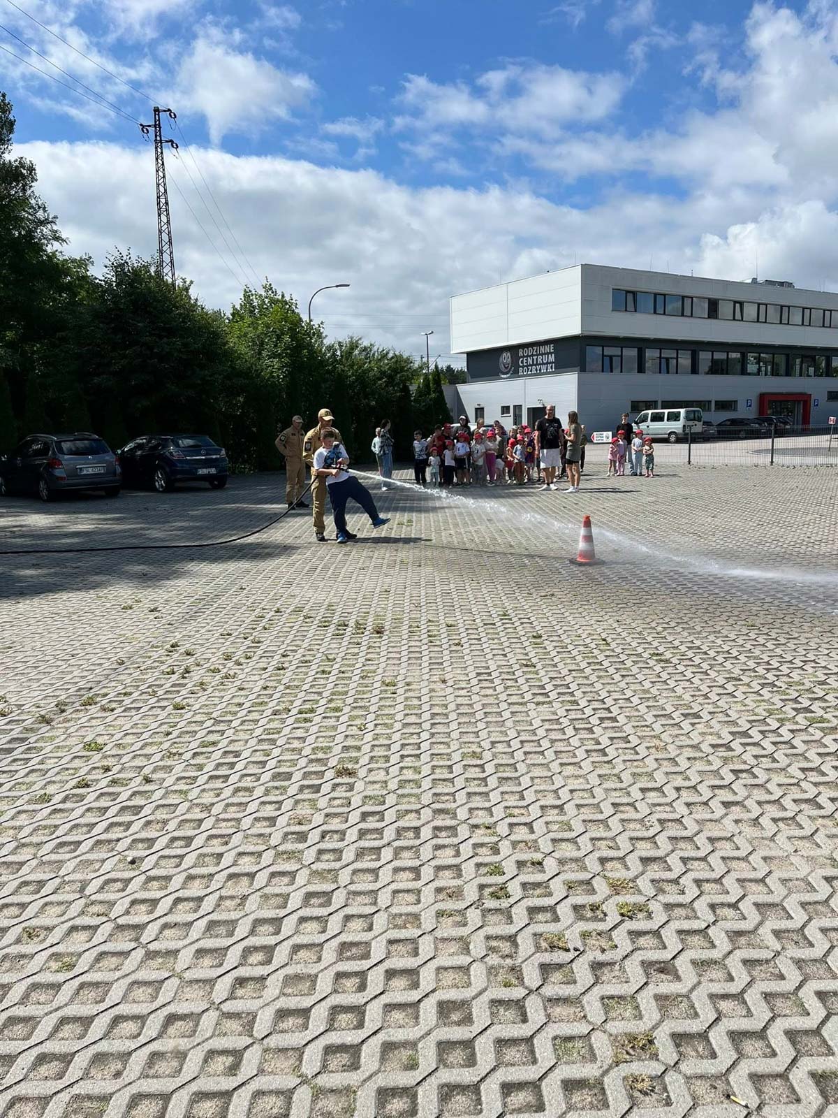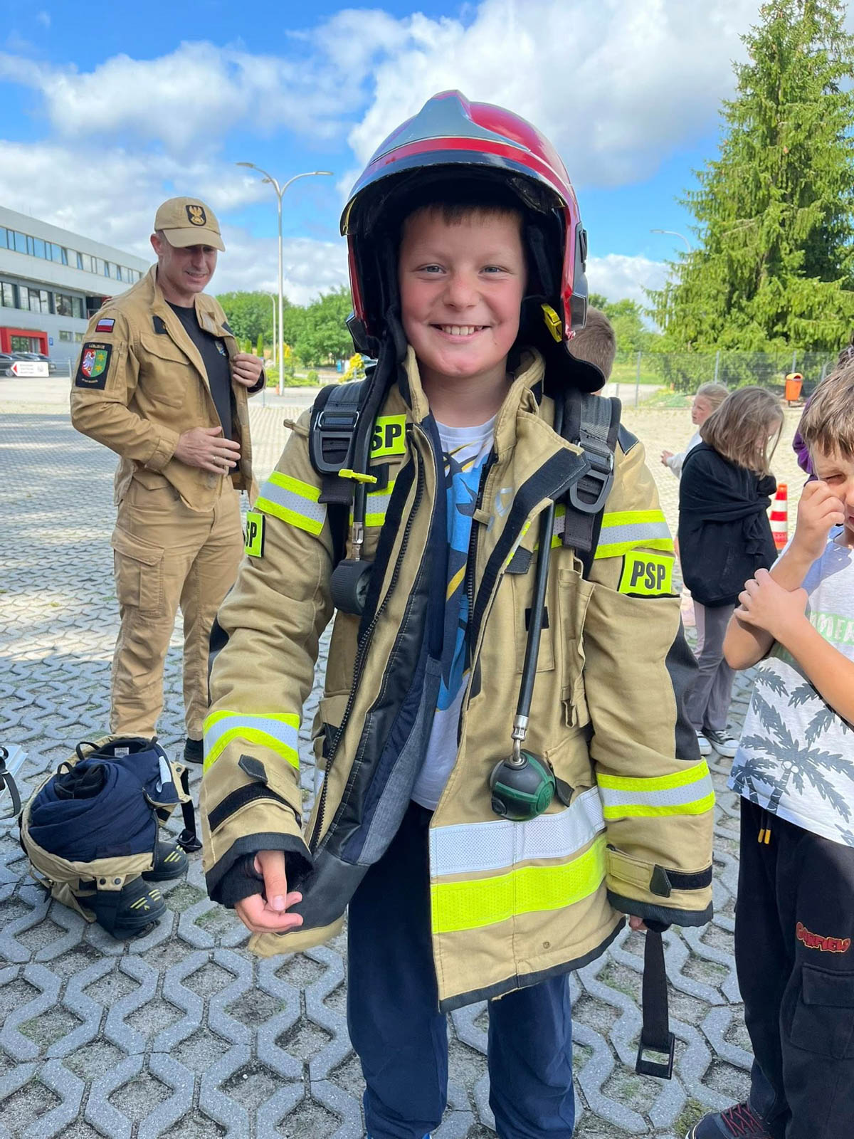 Nie zabrakło też praktyki – najmłodsi mogli przymierzyć strażackie stroje, wejść do wozu i spróbować swoich sił w gaszeniu „pożaru” z węża. Dla wielu była to pierwsza tak bliska styczność ze służbą ratowniczą.