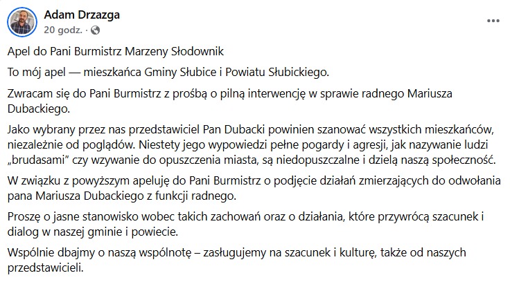 W międzyczasie jeden mieszkańców Słubic, Adam Drzazga, wystosował apel do burmistrzyni Słubic, w którym prosi o „pilną interwencję w sprawie radnego” i podjęcia działań, które „przywrócą szacunek i dialog w naszej gminie i powiecie” (ZOBACZ APEL). Ta sama osoba opublikowała list otwarty do Mariusz Dubackiego, w którym m.in. pisze, że wypowiedzi radnego „zamiast tłumić emocje pogłębiają konflikt, pogardę i poczucie wykluczenia u wielu osób” (ZOBACZ LIST).