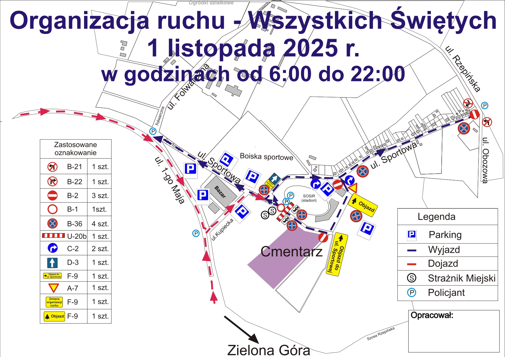 Zmiany obejmą ulice: Sportową, Obozową, Rzepińską i Kupiecką. 1 listopada w godzinach między 6 a 22 dojazd do parkingów przy cmentarzu i bazarze odbywać się będzie ulicami 1 Maja i Kupiecką, natomiast wyjazd ul. Sportową, a dalej Rzepińską, Obozową i Folwarczną. Część ul. Sportowej – od drogi brukowej prowadzącej na cmentarz do skrzyżowania z ul. Obozową i Rzepińską – będzie w tym dniu jednokierunkowa.