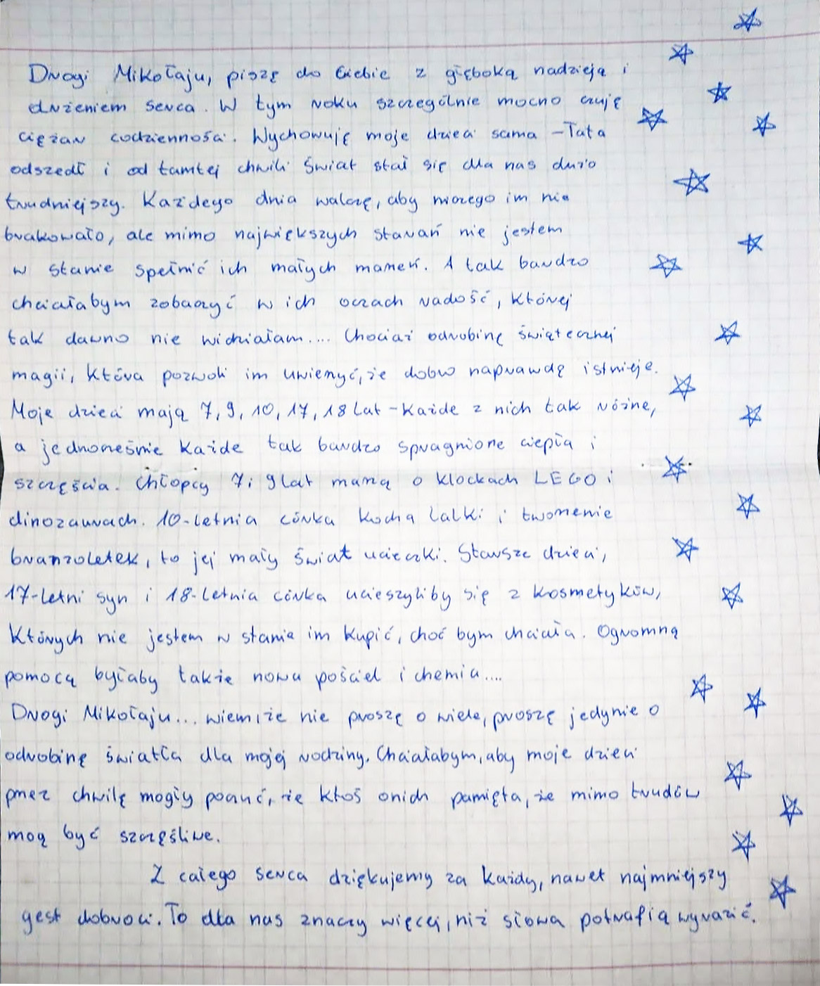 Fundacja Grupy Pomagamy opublikowała poruszający list, w którym samotna matka piątki dzieci prosi o pomoc przed zbliżającymi się świętami. Ruszyła akcja pomocy i zbiórka potrzebnych rzeczy.