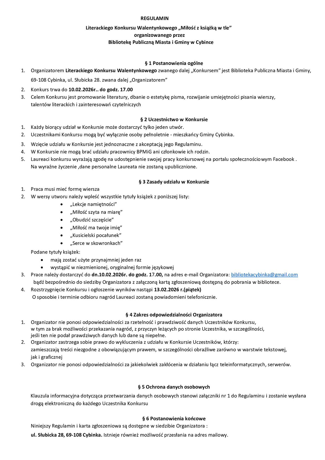 Biblioteka Publiczna Miasta i Gminy Cybinka zaprasza dorosłych mieszkańców gminy do udziału w literackim konkursie walentynkowym „Miłość z książką w tle”. Zadanie polega na napisaniu wiersza miłosnego, w którym pojawią się tytuły wybranych książek.
