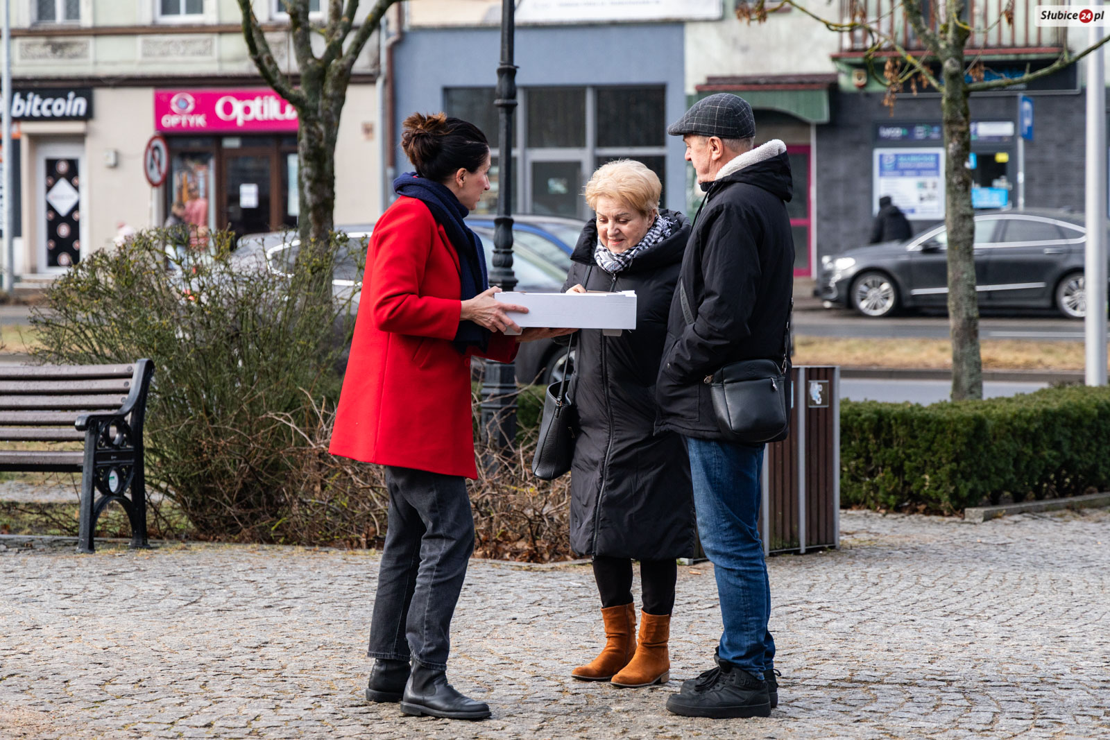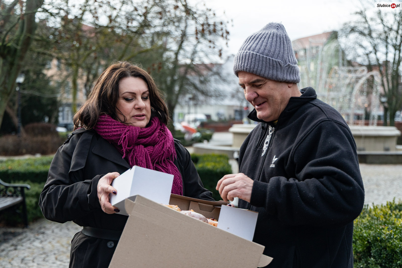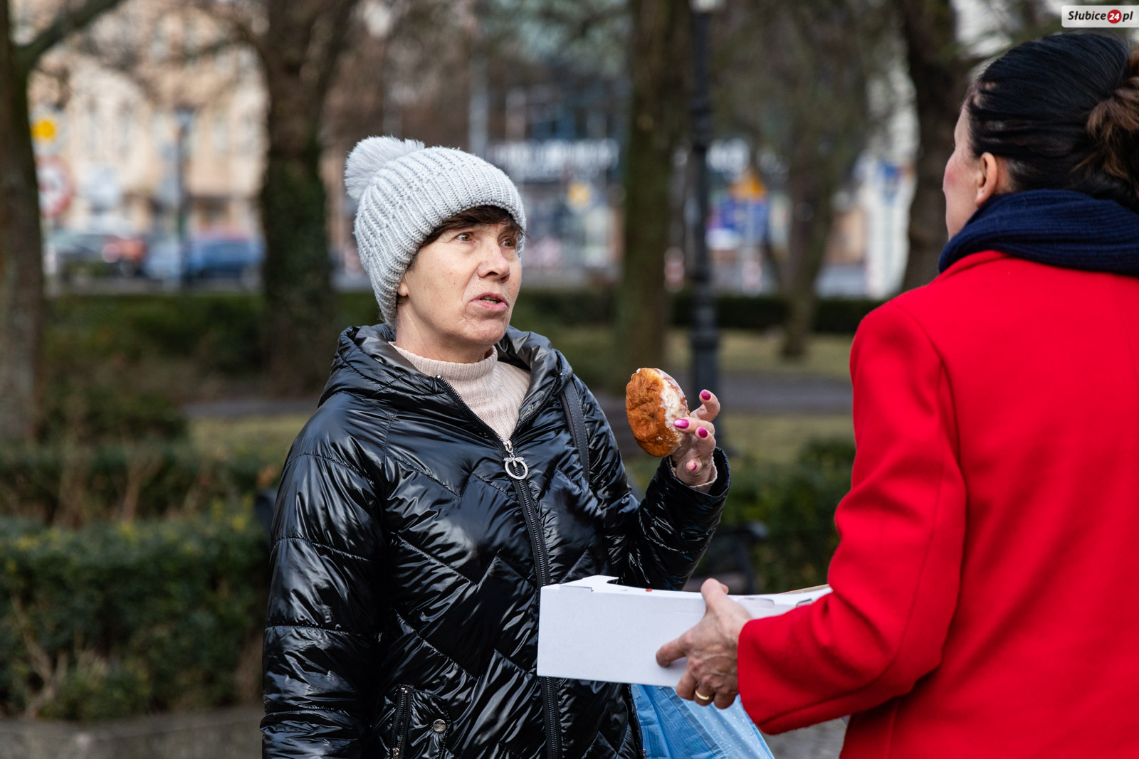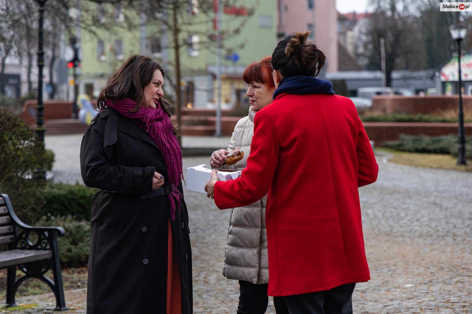 12 lutego na pl. Przyjaźni zrobiło się wyjątkowo słodko. Burmistrzyni Słubic Marzena Słodownik, wspólnie z pracowniczkami Urzędu Miejskiego, częstowała przechodniów pączkami z okazji tłustego czwartku.