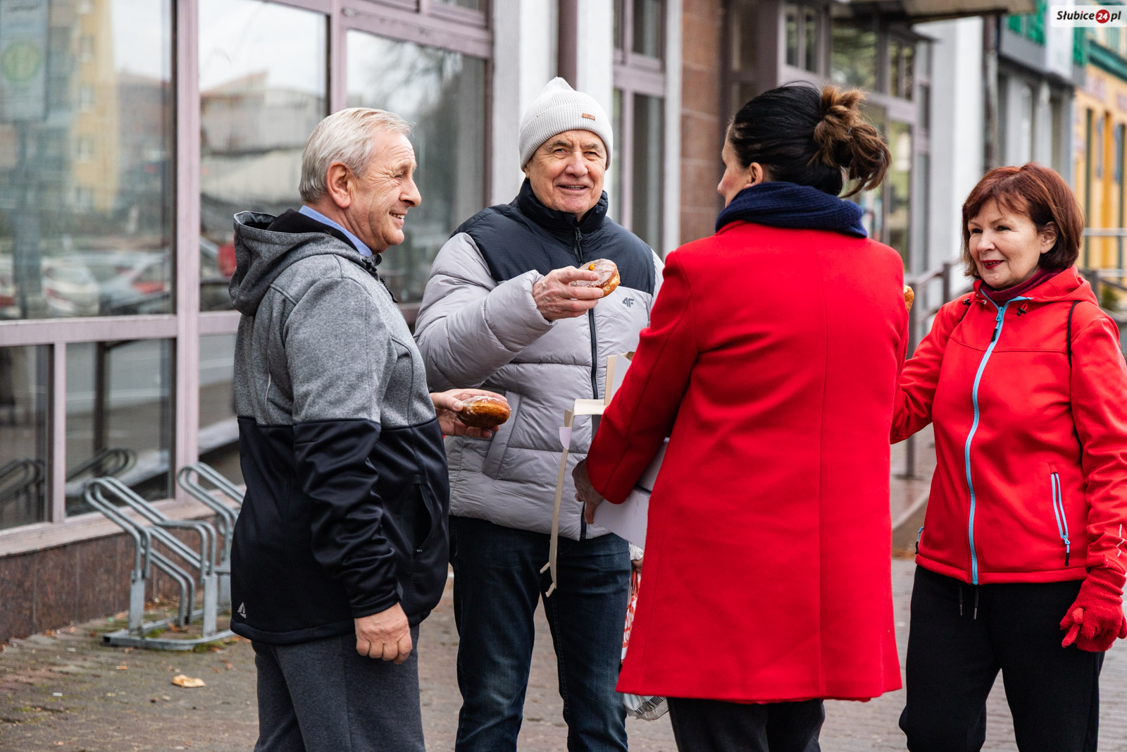 Pączki trafiały w ręce każdego, kto akurat przechodził przez plac lub otaczające go uliczki. Rozdano kilka kartonów słodkości, były też rozmowy z mieszkańcami i wspólne zdjęcia.