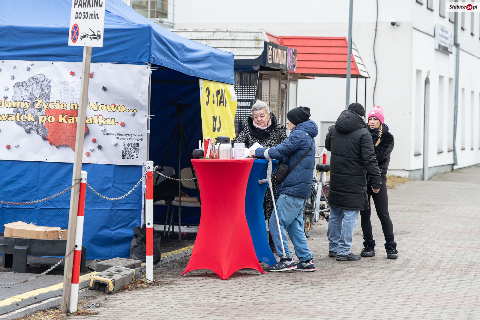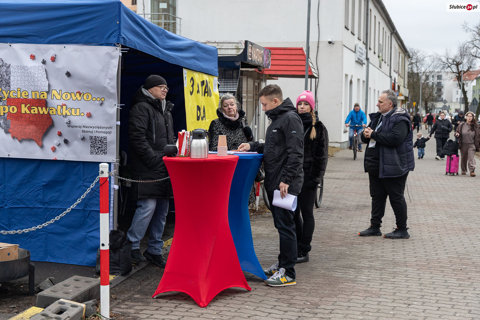 Podczas zbiórki podpisów organizatorzy przygotowali także wsparcie rzeczowe dla osób w potrzebie. Na miejscu dostępne są m.in. koce oraz artykuły higieniczne, które można odebrać lub przekazać potrzebującym. – Jeśli ktoś wie, że ma w swoim otoczeniu osobę, która potrzebuje pomocy, może podejść, wziąć takie rzeczy i po prostu jej je zanieść. Czasem to może być ktoś z sąsiedztwa, o kim wiemy, że jest w trudnej sytuacji – przekazał Robert Tomczak.