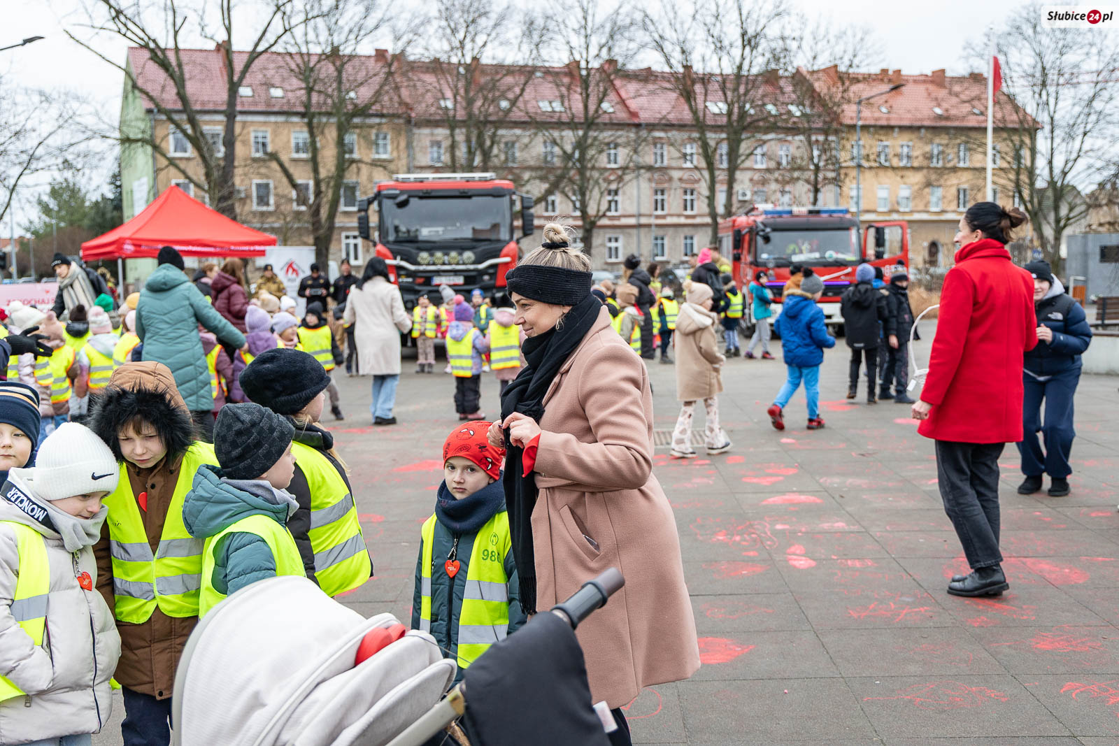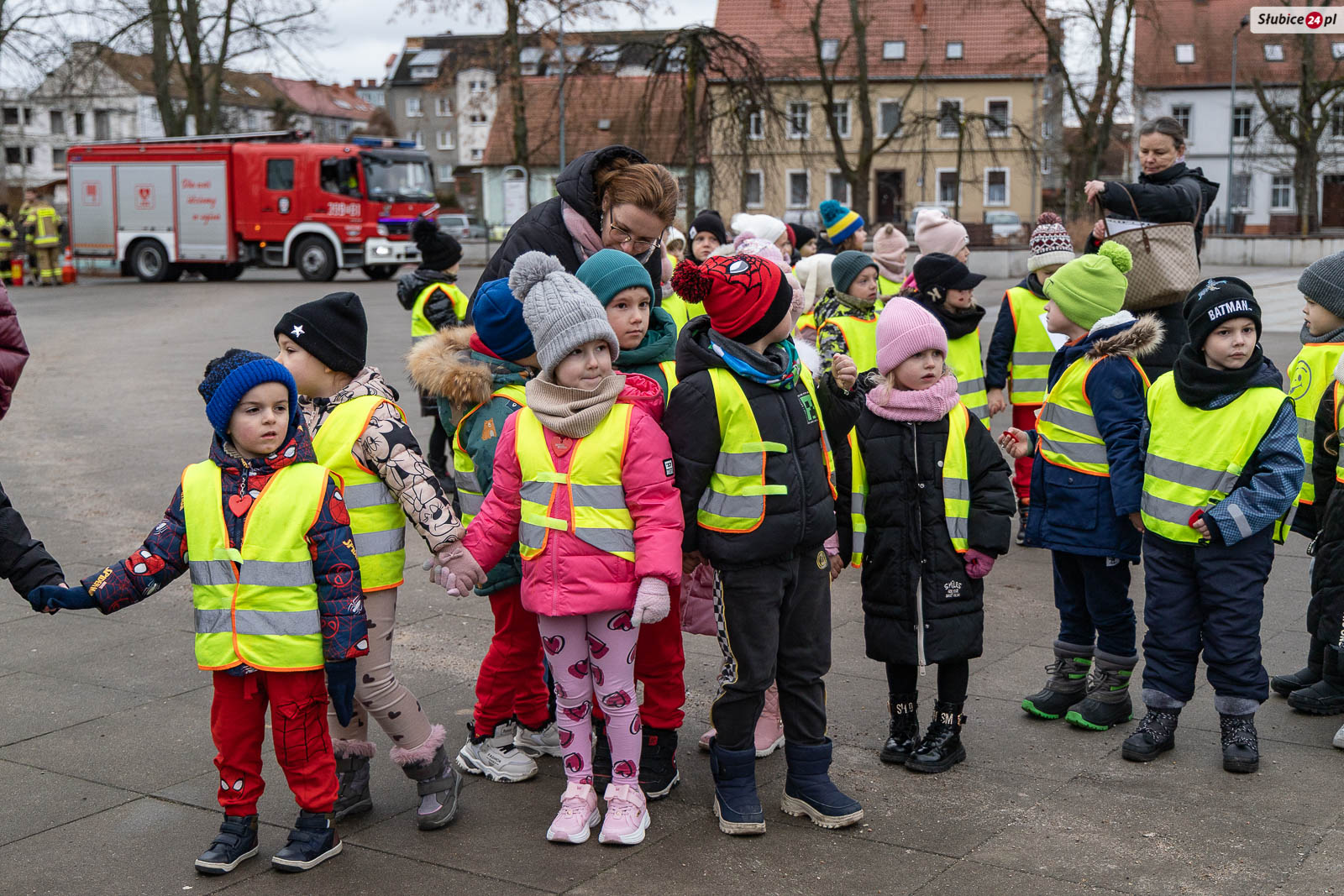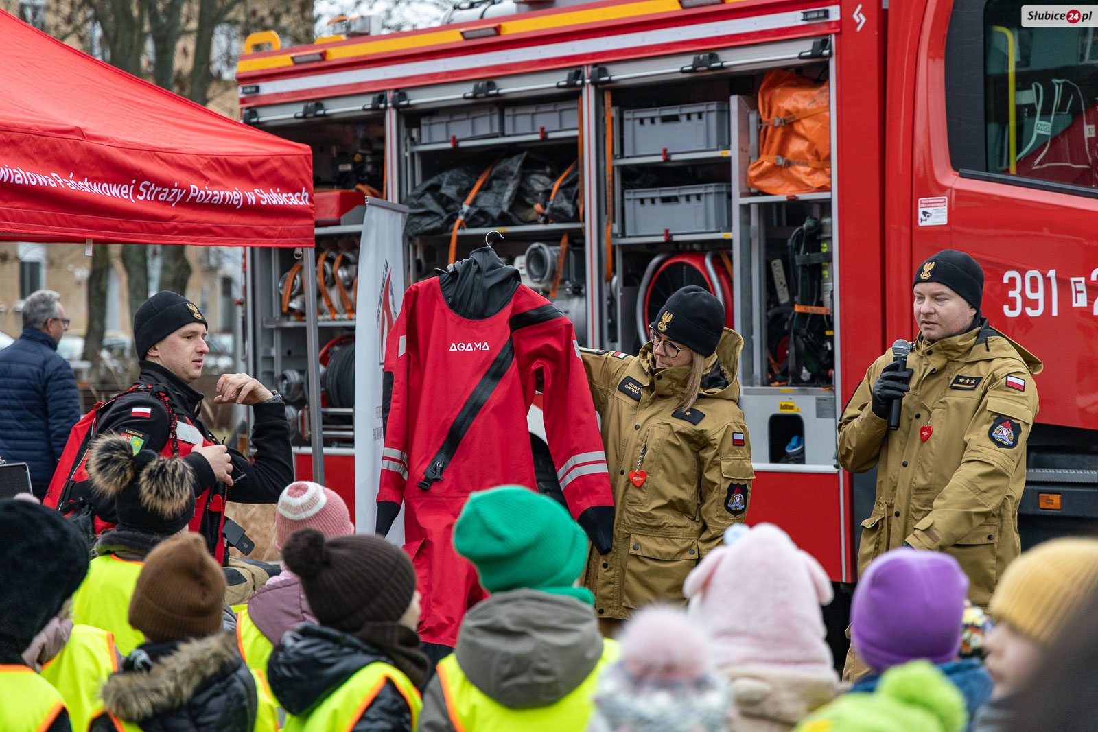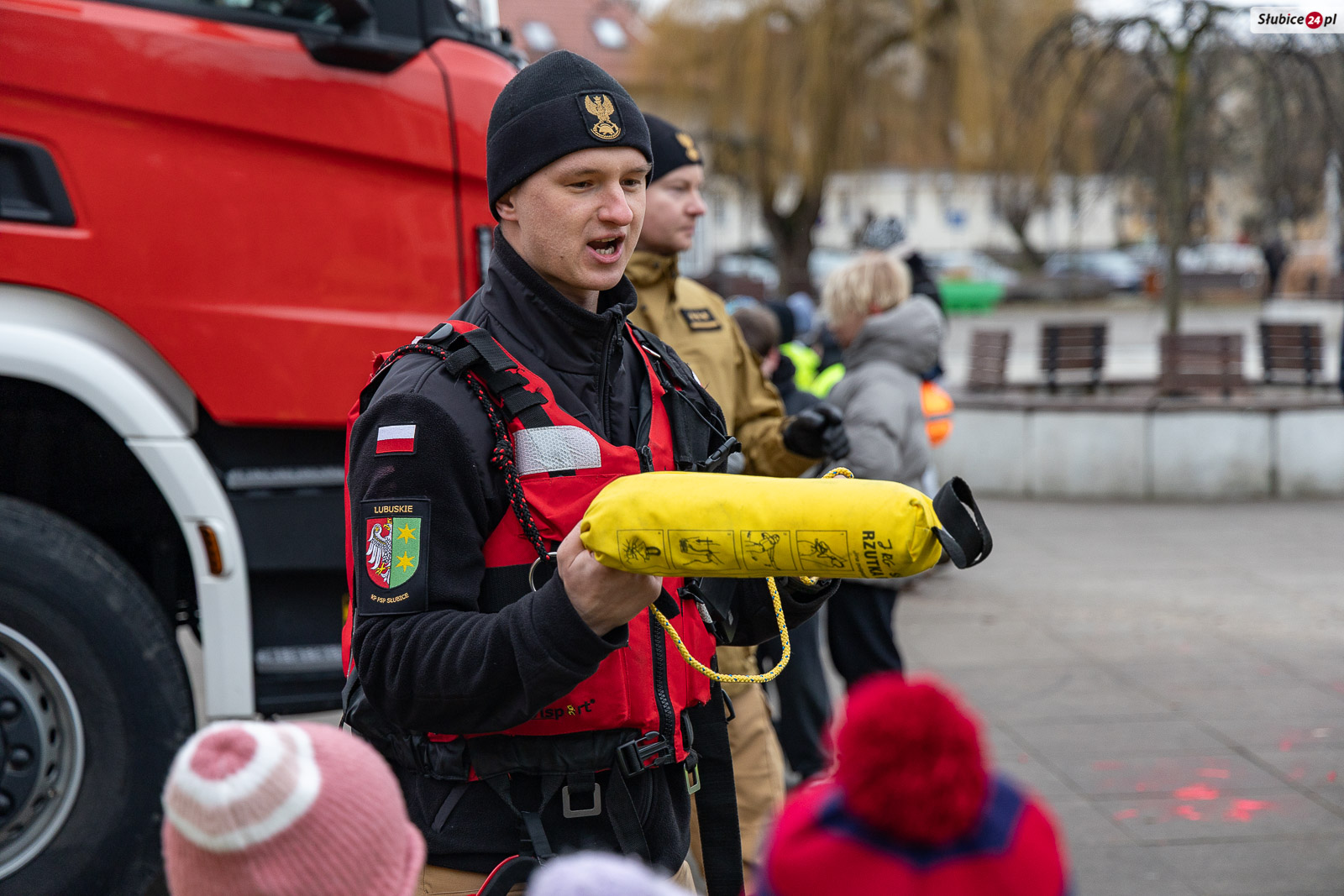 Na placu pojawili się również strażacy z Komendy Powiatowej Państwowej Straży Pożarnej i Ochotniczej Straży Pożarnej w Słubicach. Rzecznik słubickich strażaków Mateusz Maćkowiak rozmawiał z dziećmi o bezpieczeństwie podczas ferii, tłumacząc m.in. zasady ewakuacji czy działanie czujników dymu. Była też rozmowa o numerze alarmowym – Numer 112 łatwo zapamiętać: mamy jedną brodę, jeden nos i dwoje oczu – razem to 1-1-2! – mówiła Monika Chrobak z KP PSP Słubice.
