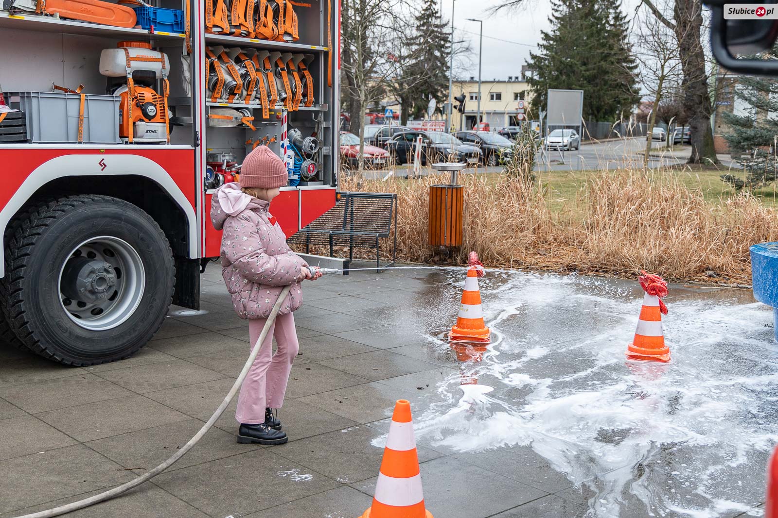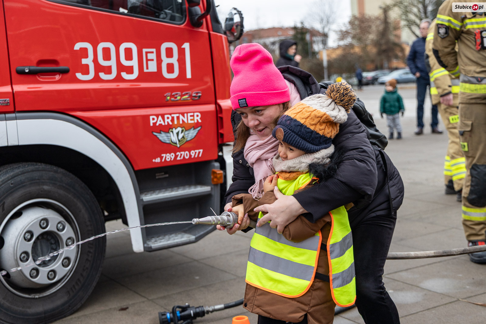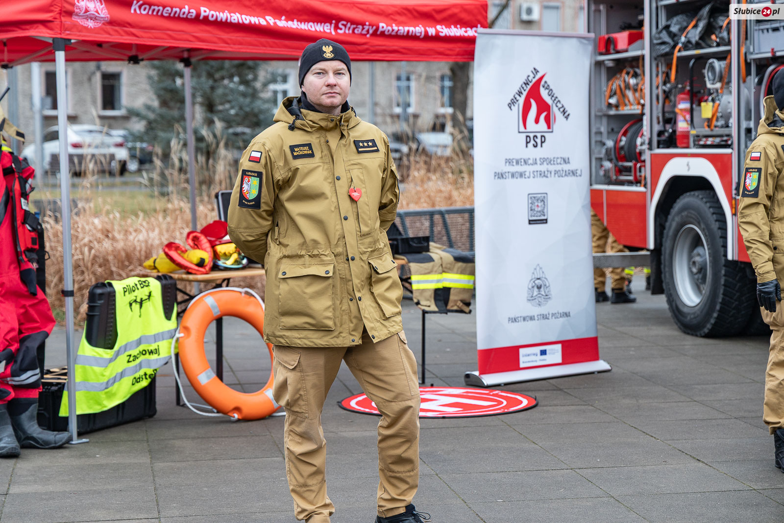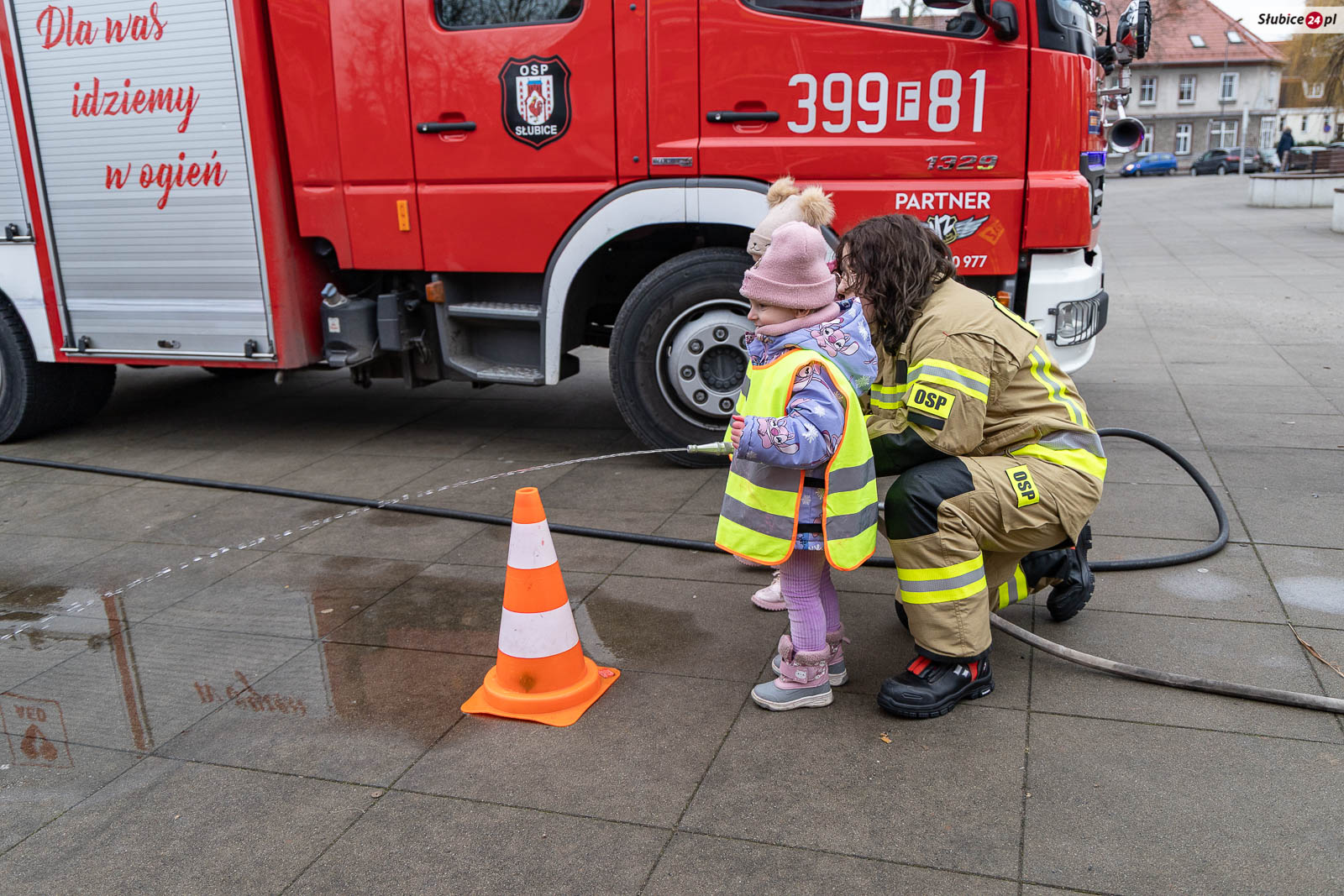 Na placu pojawili się również strażacy z Komendy Powiatowej Państwowej Straży Pożarnej i Ochotniczej Straży Pożarnej w Słubicach. Rzecznik słubickich strażaków Mateusz Maćkowiak rozmawiał z dziećmi o bezpieczeństwie podczas ferii, tłumacząc m.in. zasady ewakuacji czy działanie czujników dymu. Była też rozmowa o numerze alarmowym – Numer 112 łatwo zapamiętać: mamy jedną brodę, jeden nos i dwoje oczu – razem to 1-1-2! – mówiła Monika Chrobak z KP PSP Słubice.