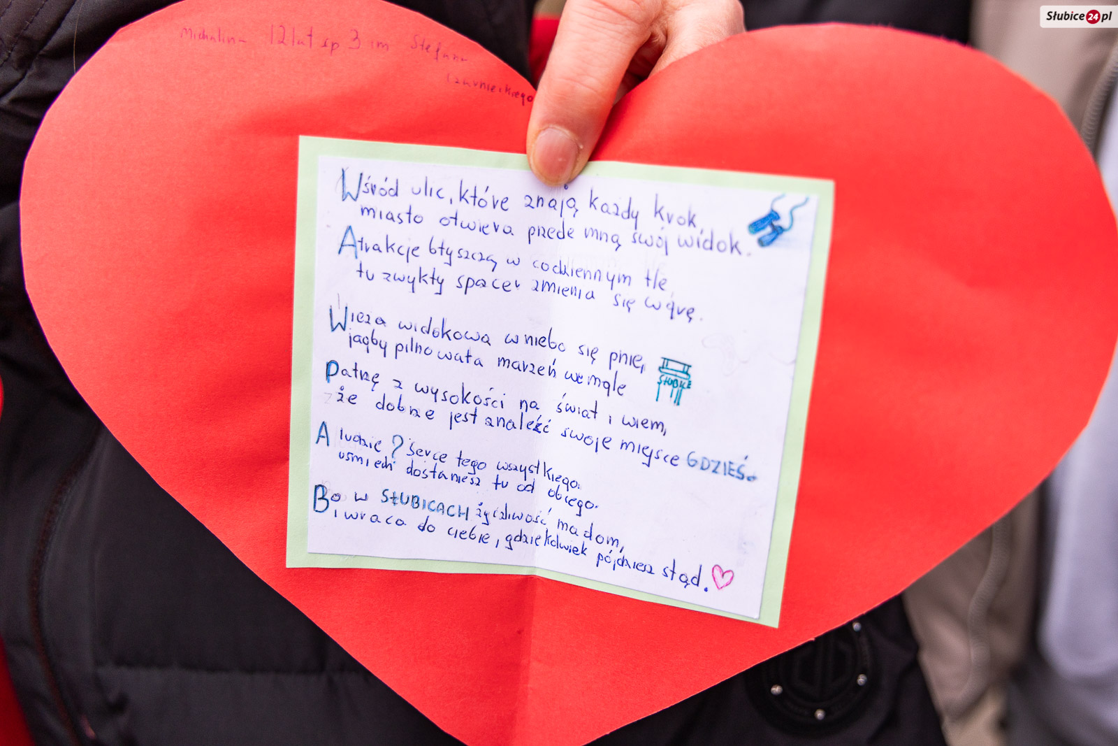 Najmłodsi mieszkańcy mieli okazję również opowiedzieć, za co kochają Słubice. Dzieci przyniosły własnoręcznie wykonane kartki walentynkowe, które trafiały do specjalnej skrzynki. Zanim jednak je tam wrzucono, niektóre z listów odczytywała rzeczniczka Gminy Słubice Katarzyna Pazurkiewicz. Dzieci pisały w nich, że kochają miasto bo tu jest ich dom, ich rodzina, przyjaciele i ulubione przedszkole, ale również dlatego, że zawsze jest tu piękna pogoda i czyste ulice.