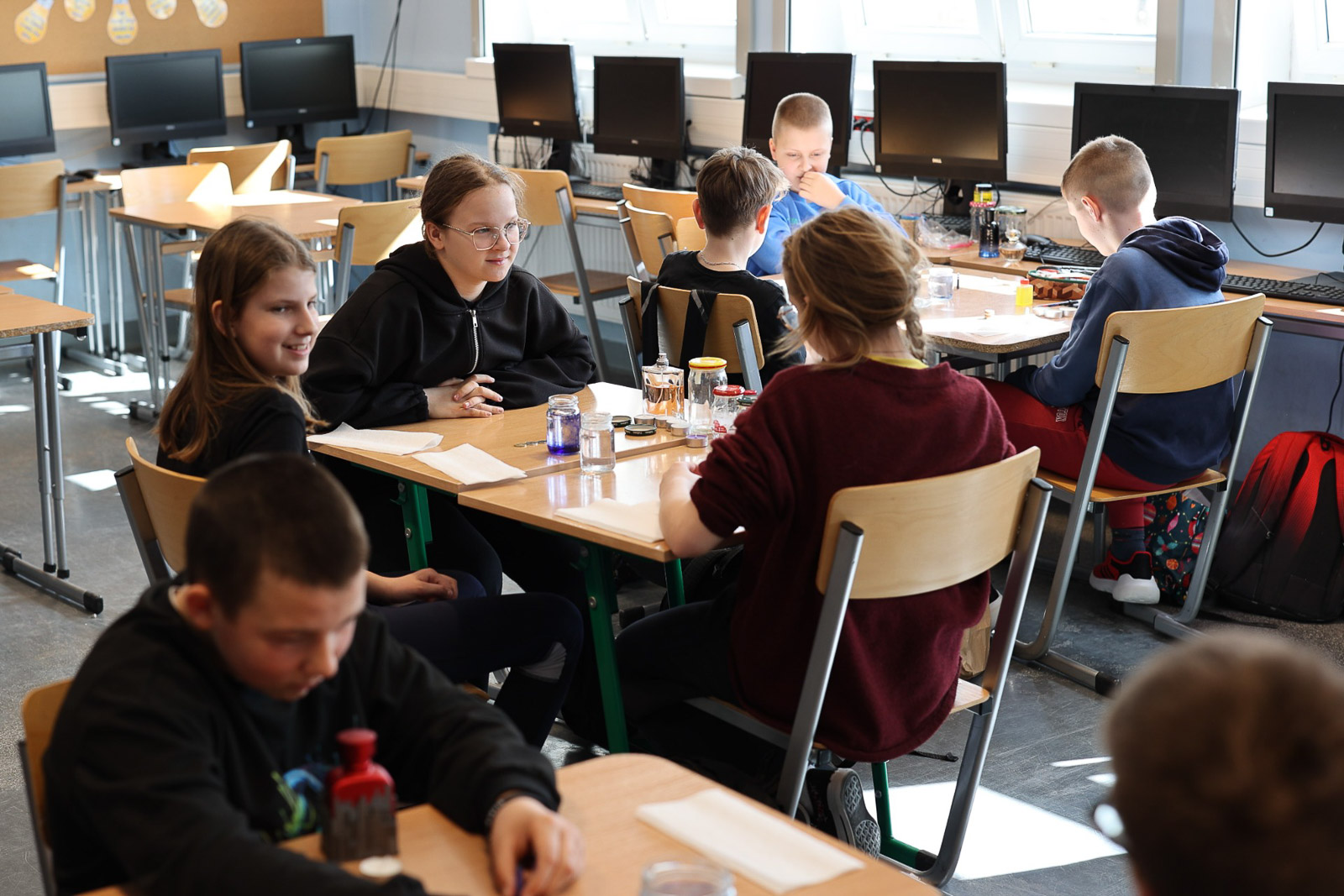 W Szkole Podstawowej nr 2 w Słubicach uczniowie podczas zajęć z języka niemieckiego poznawali kolory oraz nazwy miejsc i pomieszczeń, korzystając z kart pracy i quizu multimedialnego. Młodsza grupa ćwiczyła rozmówki i przygotowywała drzewo genealogiczne.