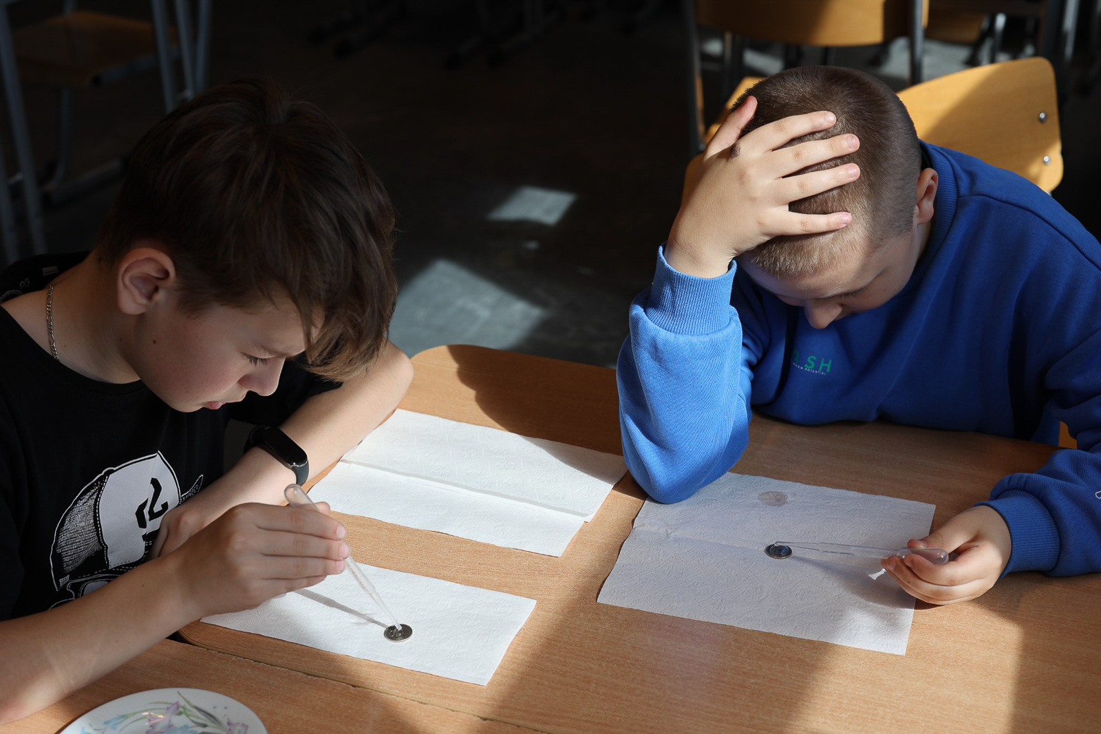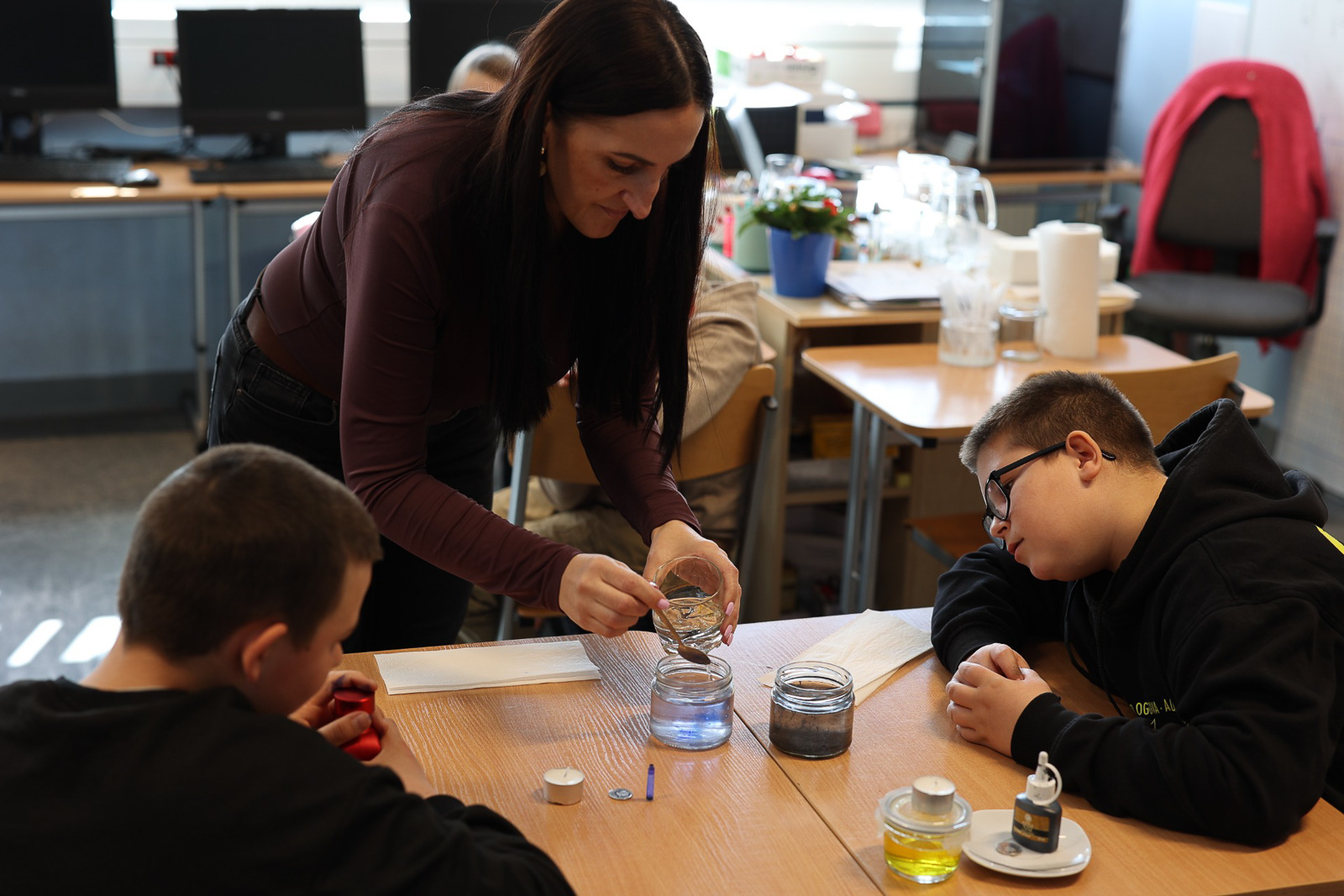 Z kolei w Golicach uczniowie prowadzili doświadczenia związane z właściwościami ciepłej i zimnej wody. Obserwowali m.in. rozpuszczanie, proces skraplania oraz tworzenie się menisku wypukłego.