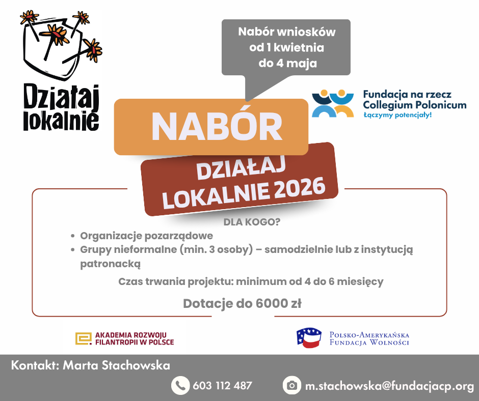 Fundacja na rzecz Collegium Polonicum ogłosiła nabór wniosków w ramach Lokalnego Konkursu Grantowego „Działaj Lokalnie 2026”. Program realizowany jest we współpracy z Akademią Rozwoju Filantropii w Polsce i finansowany ze środków Polsko-Amerykańskiej Fundacji Wolności.