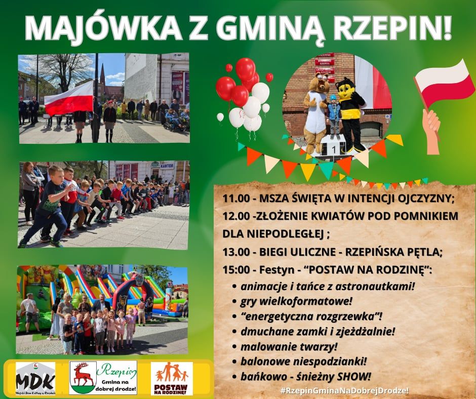 Wydarzenia rozpoczną się od mszy świętej w intencji ojczyzny, złożenia kwiatów pod pomnikiem oraz przemarszu pocztów sztandarowych. Następnie na uczestników czekają biegi uliczne „Rzepińska Pętla”, a po nich wystartuje festyn rodzinny „Postaw na rodzinę” z mnóstwem animacji i niespodzianek dla najmłodszych.