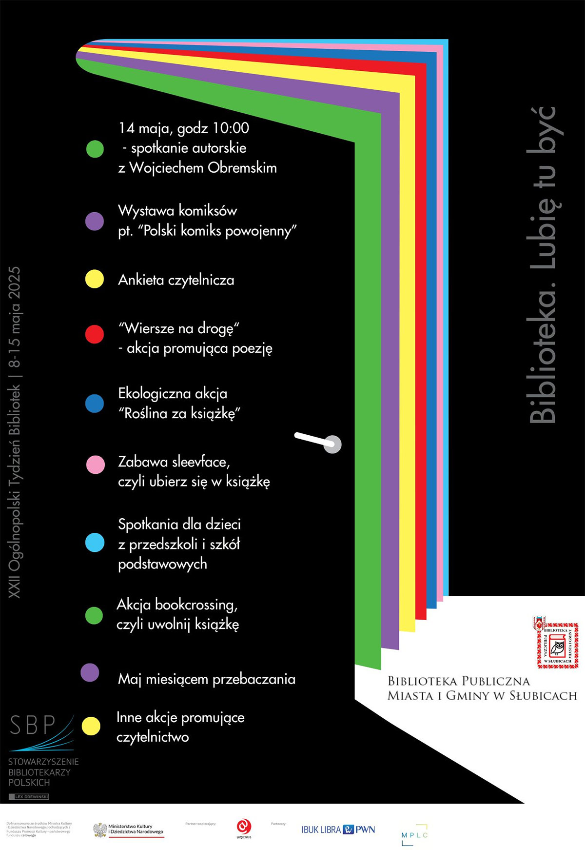 W wydarzenie tradycyjnie włącza się Biblioteka Publiczna Miasta i Gminy w Słubicach. W przygotowanym przez słubickich bibliotekarzy programie znalazło się wiele wydarzeń, zarówno dla młodszych, jak i starszych czytelników. Najmłodsi – uczniowie przedszkoli i szkół podstawowych – mogą liczyć na kreatywne zajęcia i zabawy. Starsi odbiorcy będą mogli wziąć udział w spotkaniu autorskim z Wojciechem Obremskim, które zaplanowano na 14 maja na godz. 10:00.