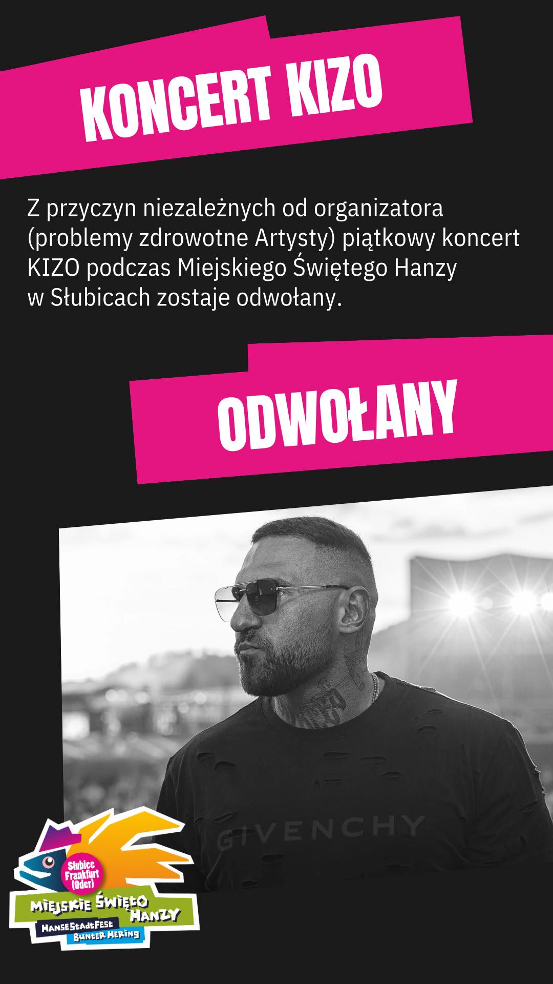 Kizo jednak nie przyjedzie do Słubic. Słubicki Miejski Ośrodek Kultury poinformował, że jego koncert podczas tegorocznego Miejskiego Święta Hanzy został odwołany. Powodem są problemy zdrowotne artysty.