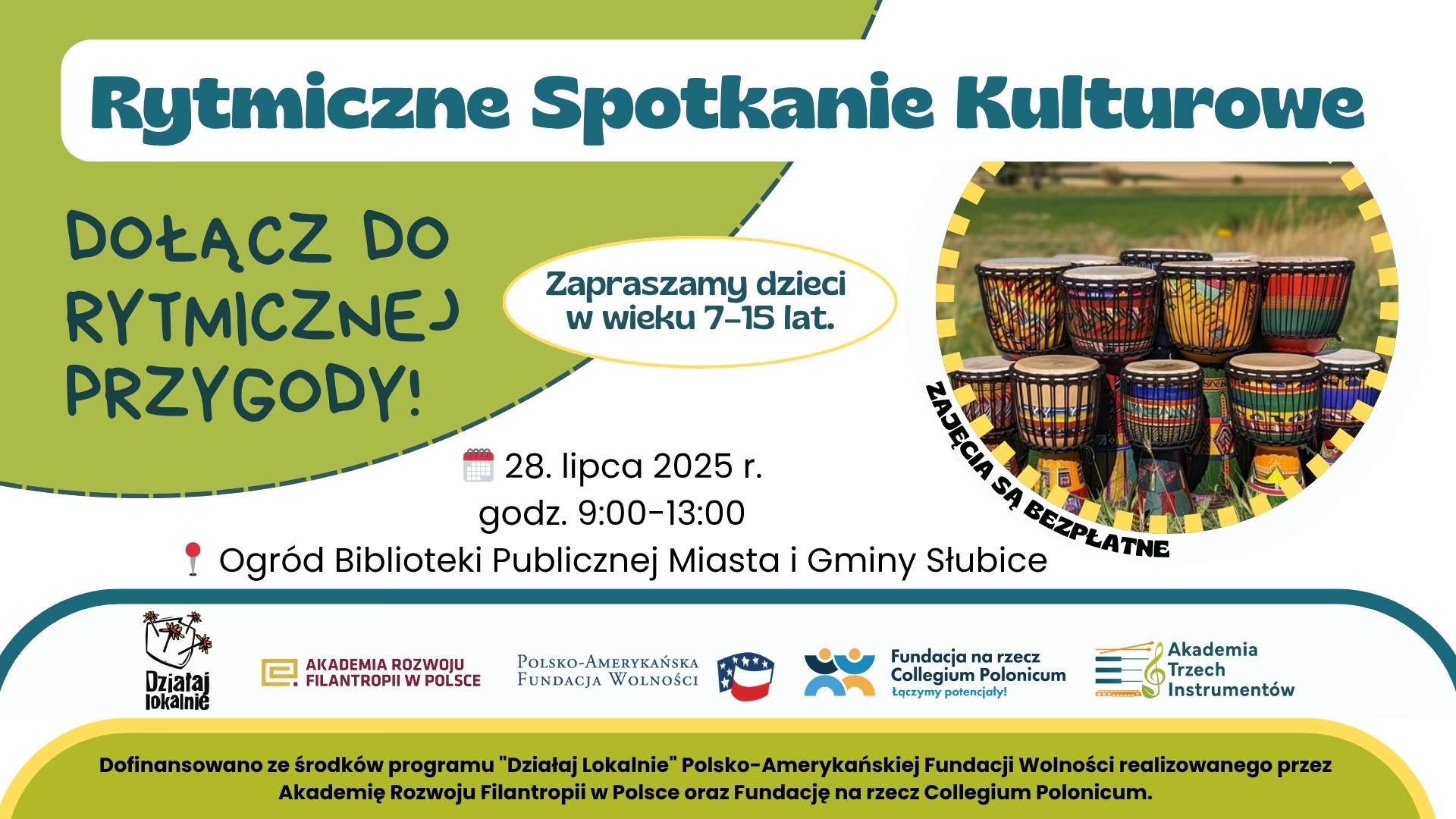Już 28 lipca ogród Biblioteki Publicznej Miasta i Gminy Słubice zamieni się w przestrzeń pełną rytmów i bębnów. Akademia Trzech Instrumentów zaprasza dzieci w wieku 7–15 lat na bezpłatne warsztaty perkusyjne „Rytmiczne Spotkanie Kulturowe”.
