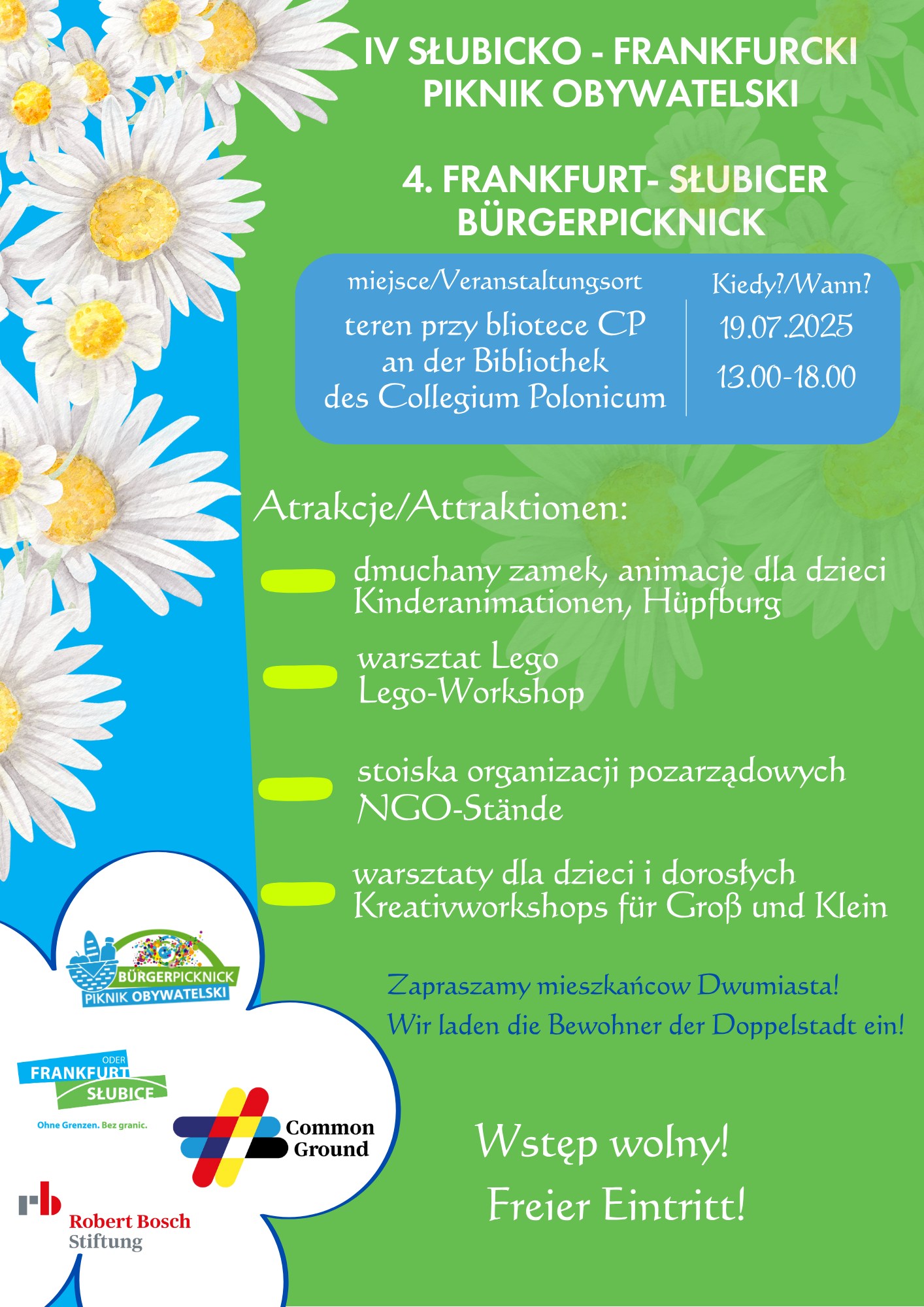 Organizatorami IV Słubicko-Frankfurckiego Pikniku Obywatelskiego są: Gmina Słubice, Miasto Frankfurt nad Odrą, Fundacja na rzecz Collegium Polonicum, Arbeiten und Leben in historischen Gebäuden gGmbH, Quartiersmanagement Innenstadt-Beresinchen oraz stowarzyszenie Unsere Miasto – Nasze Stadt. Projekt został dofinansowany w ramach programu „Common Ground” Fundacji Roberta Boscha.