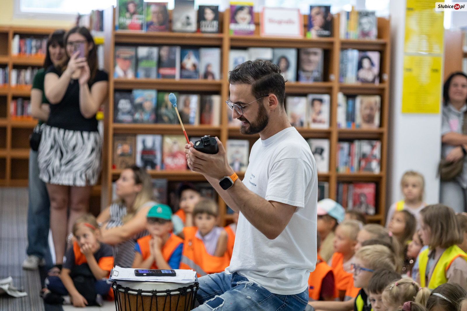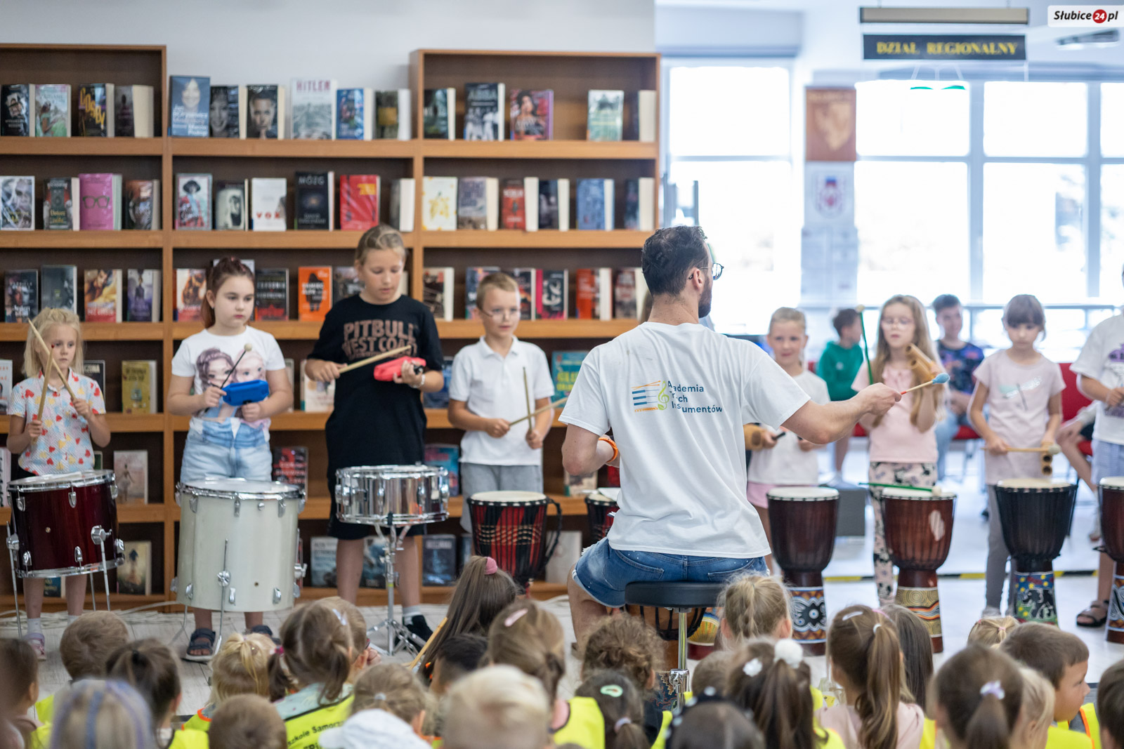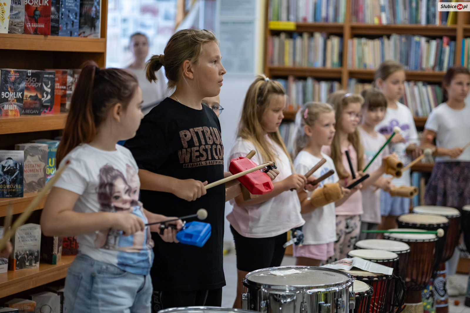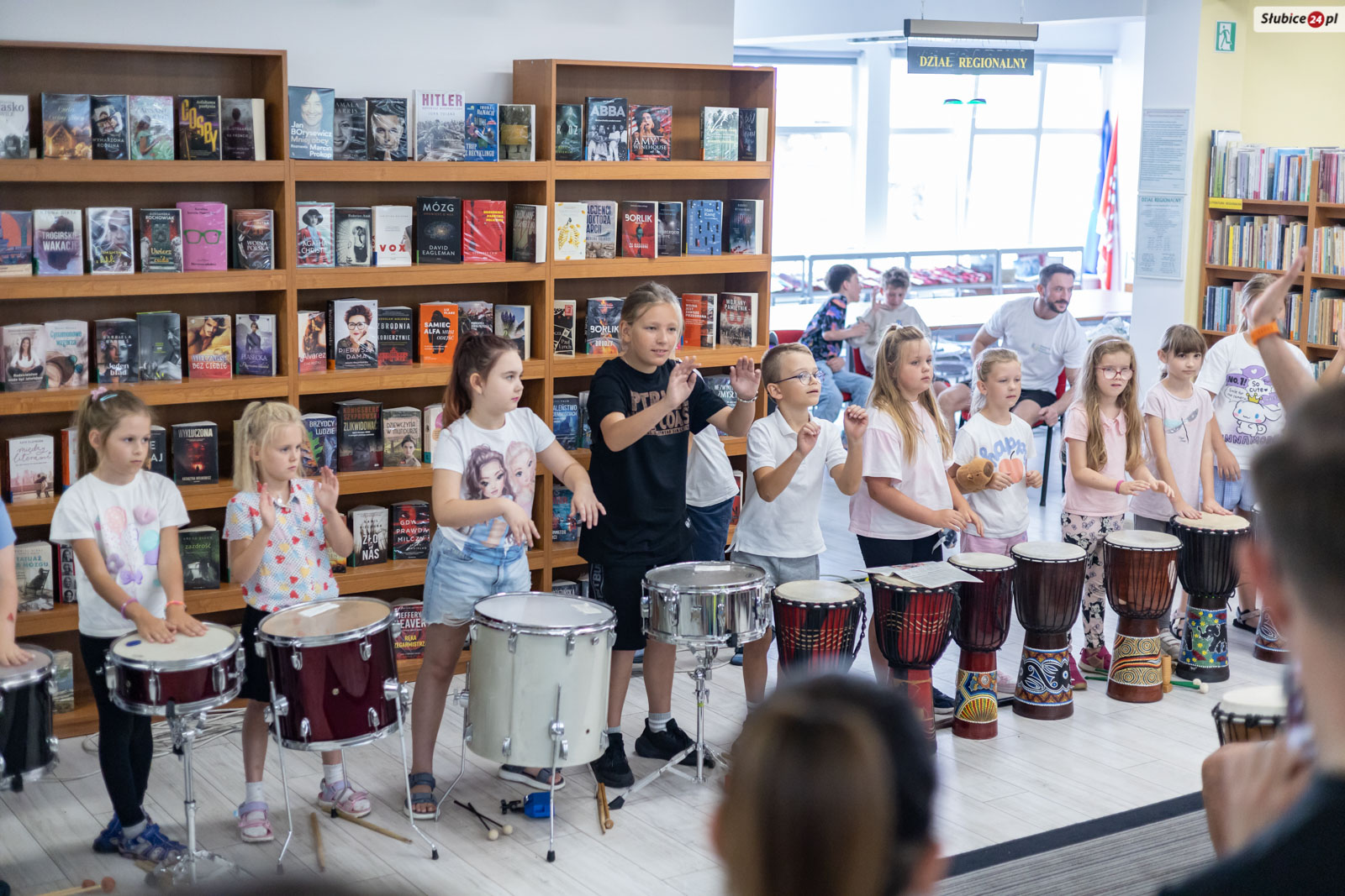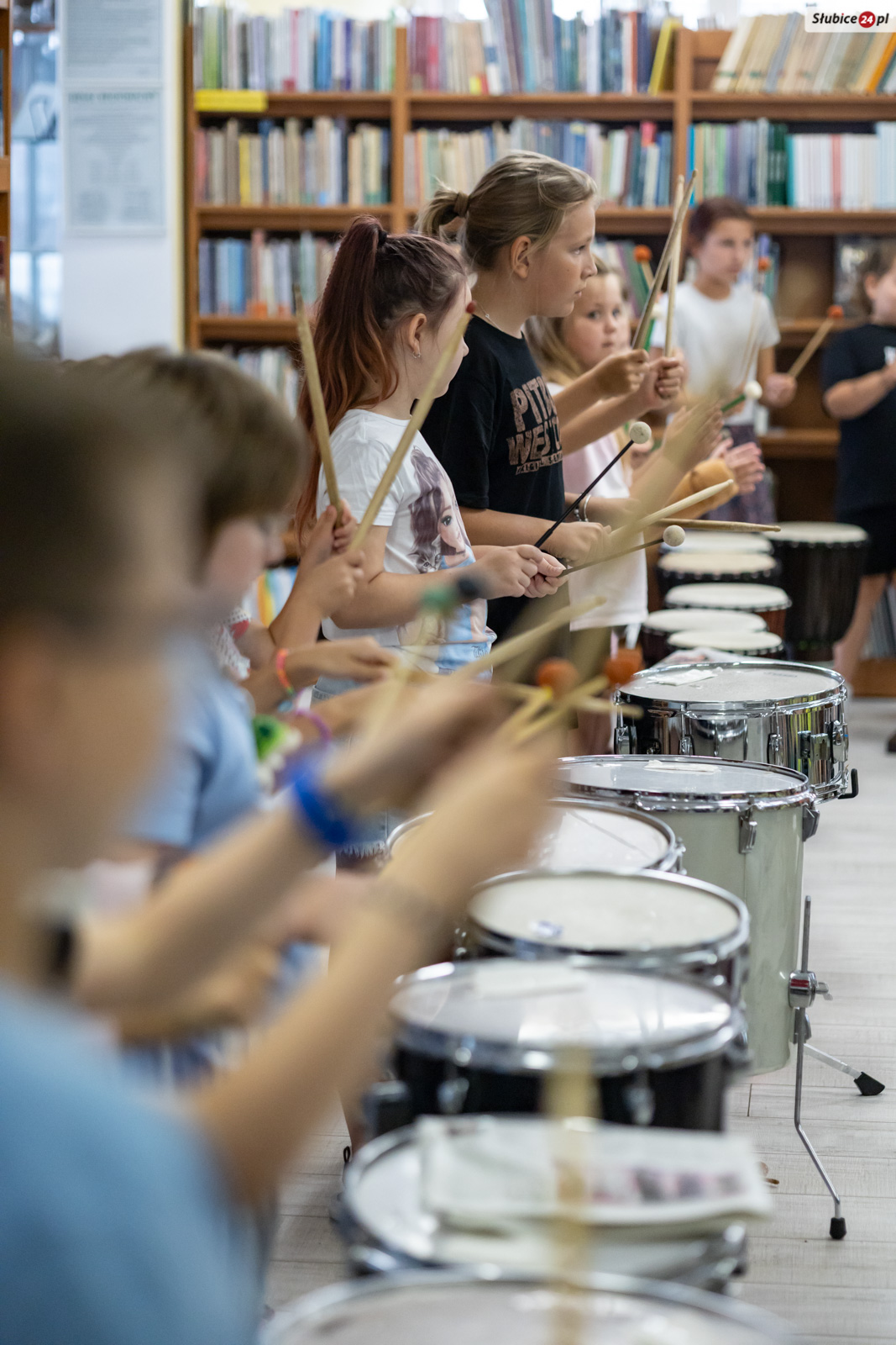 Choć kapryśna pogoda pokrzyżowała plany i przeniosła koncert z ogrodu do wnętrza biblioteki, nie odebrało to energii uczestnikom warsztatów perkusyjnych „Rytmiczne Spotkanie Kulturowe”. Młodzi muzycy zagrali dla mieszkańców Słubic, pokazując, czego nauczyli się podczas wspólnych ćwiczeń z Akademią Trzech Instrumentów.