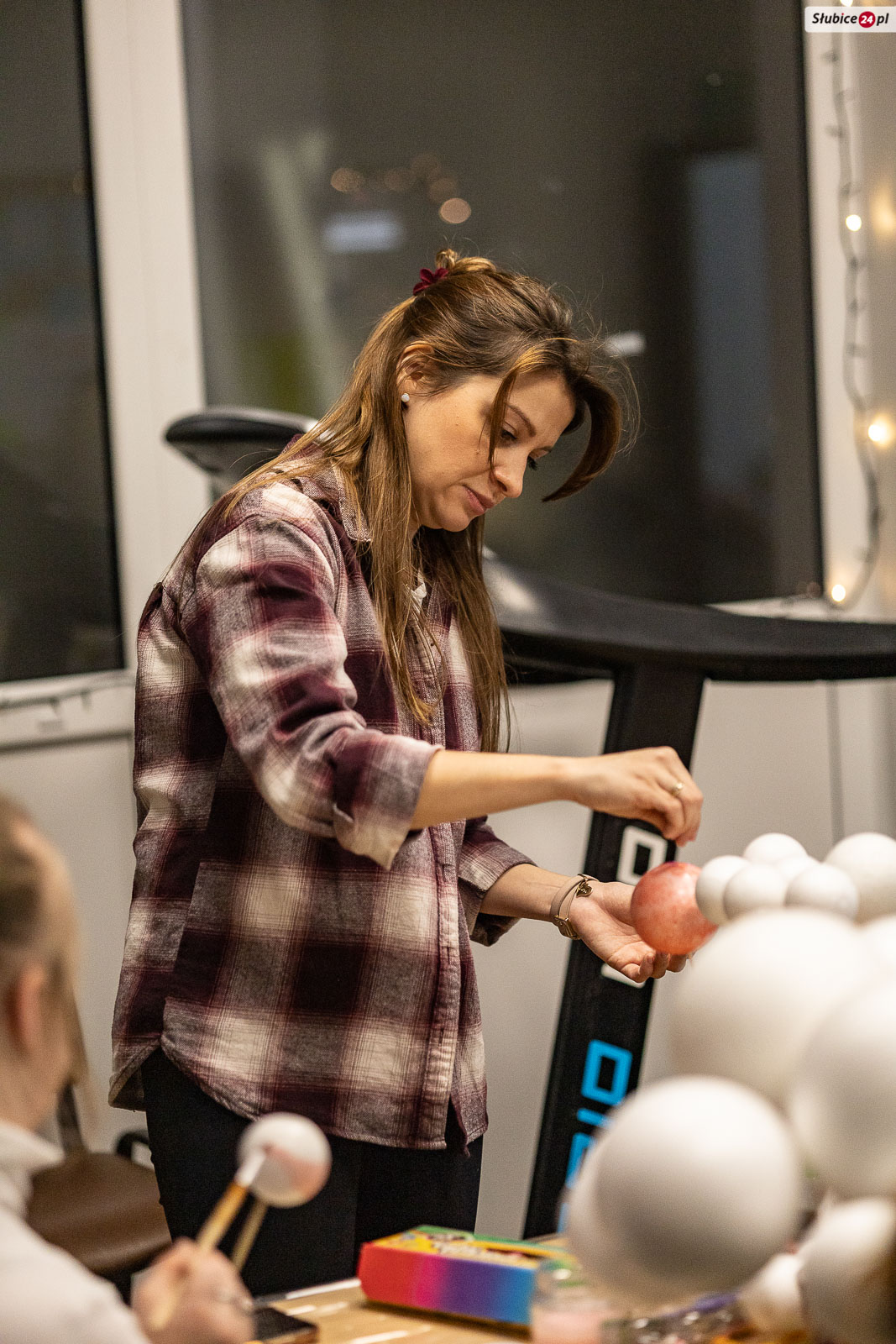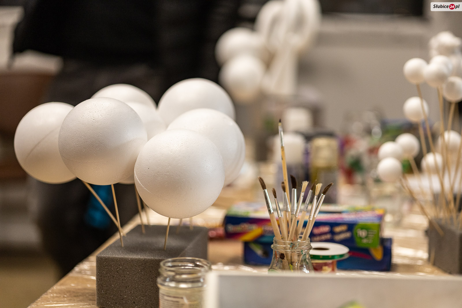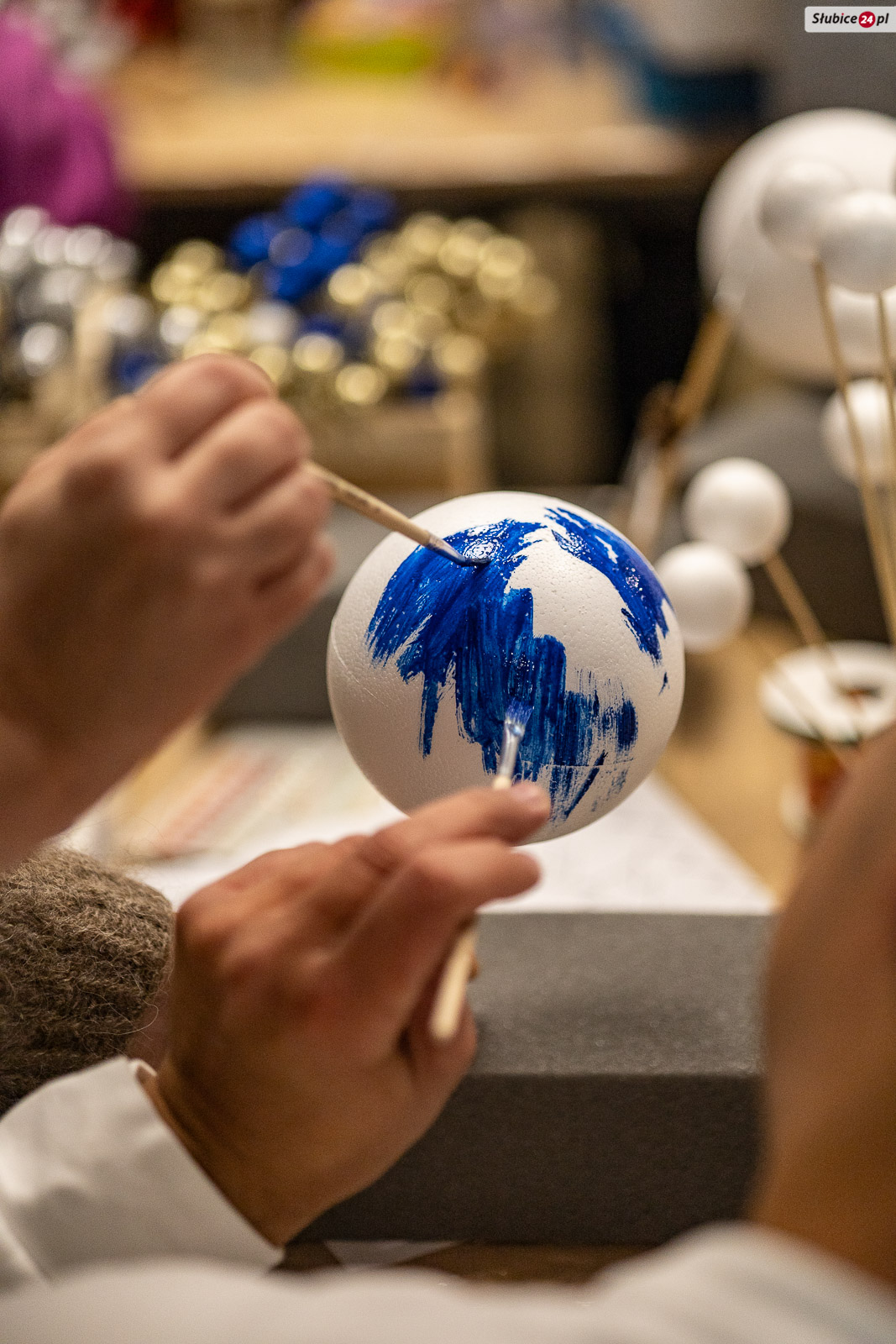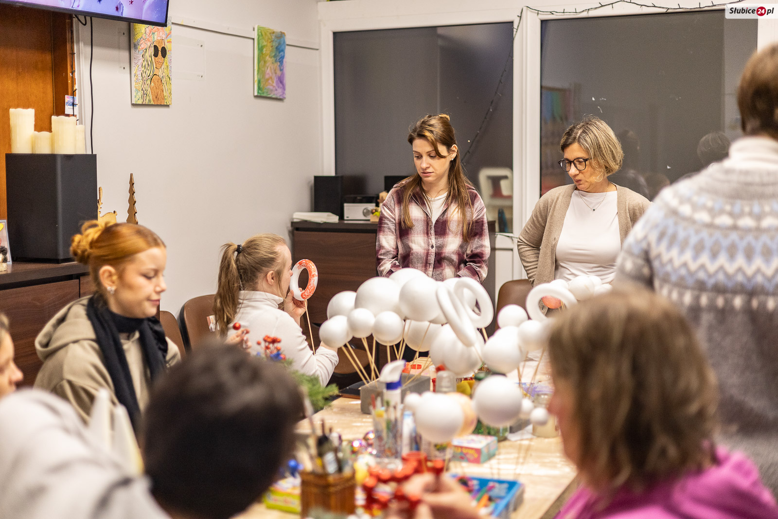 Uczestnicy warsztatów tworzyli własne świąteczne ozdoby. Na stołach czekały styropianowe bombki, wieńce, cekiny, pomponiki, farby, kartki, brokat i mnóstwo innych materiałów, które rozbudzały wyobraźnię. Nie zabrakło również słodkiego akcentu – dla wszystkich przygotowano gorące kakao.
