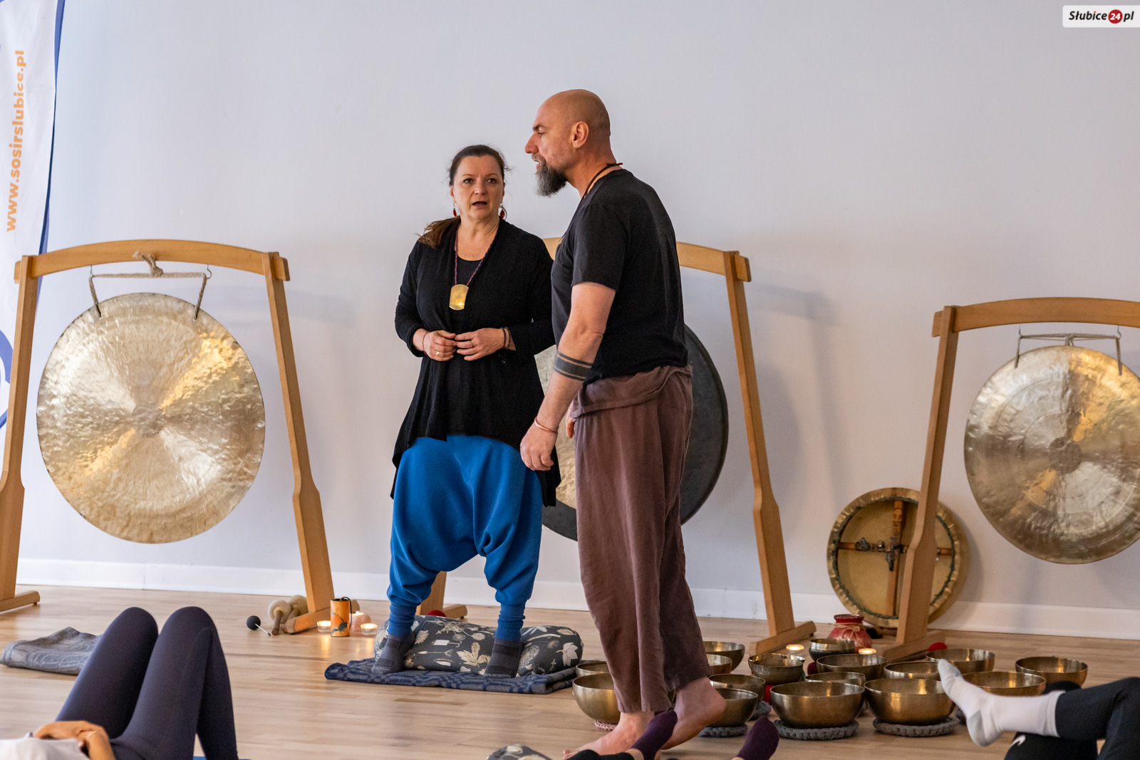 Po warsztatach oddechowych przyszedł czas na relaksacyjną „podróż z dźwiękiem” z Anitą Kumecką-Petzold. Uczestnicy, leżąc na matach, wsłuchiwali się w dźwięki mis, a prowadząca zachęcała do wyobrażania sobie różnych obrazów i sytuacji.