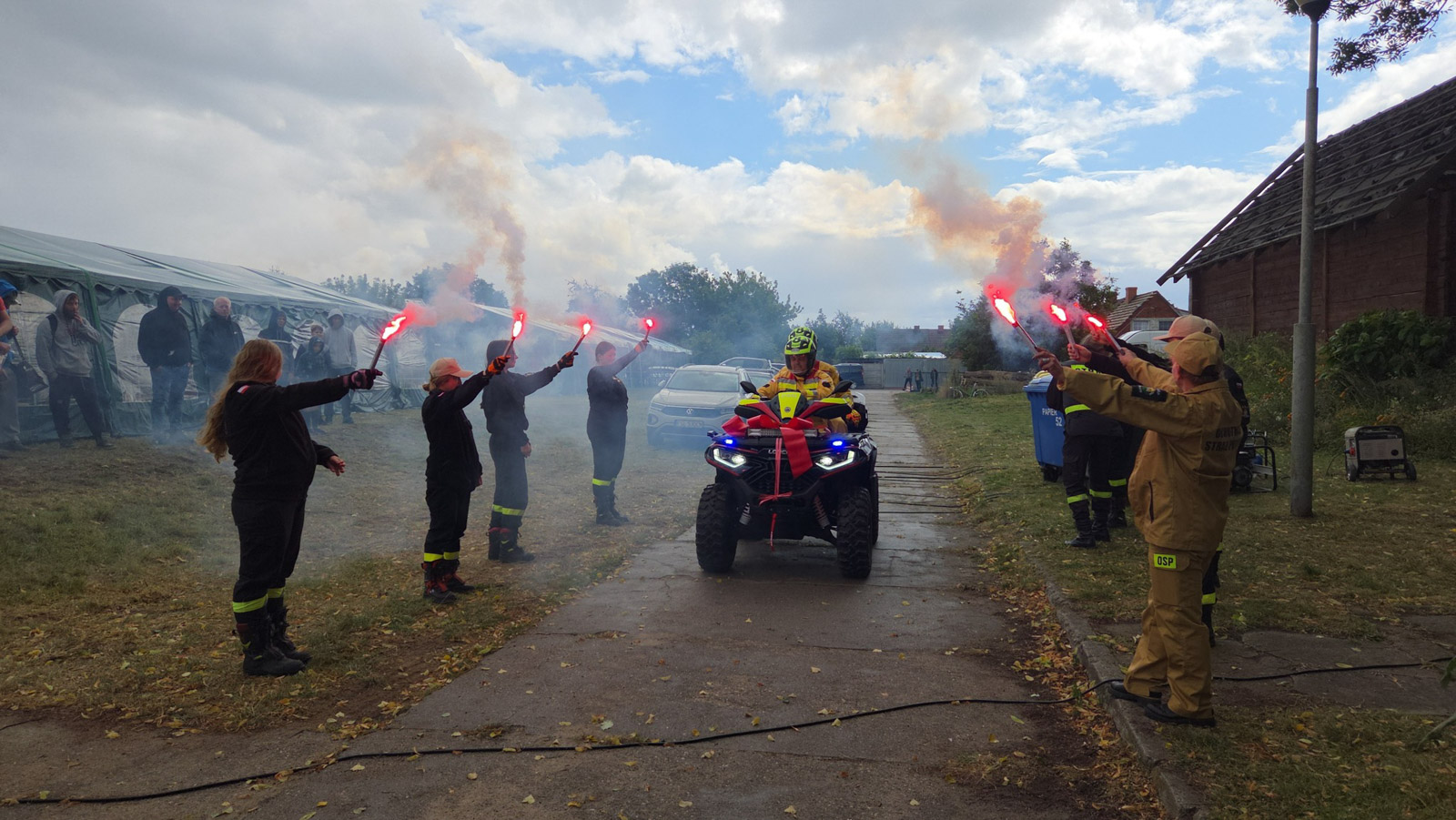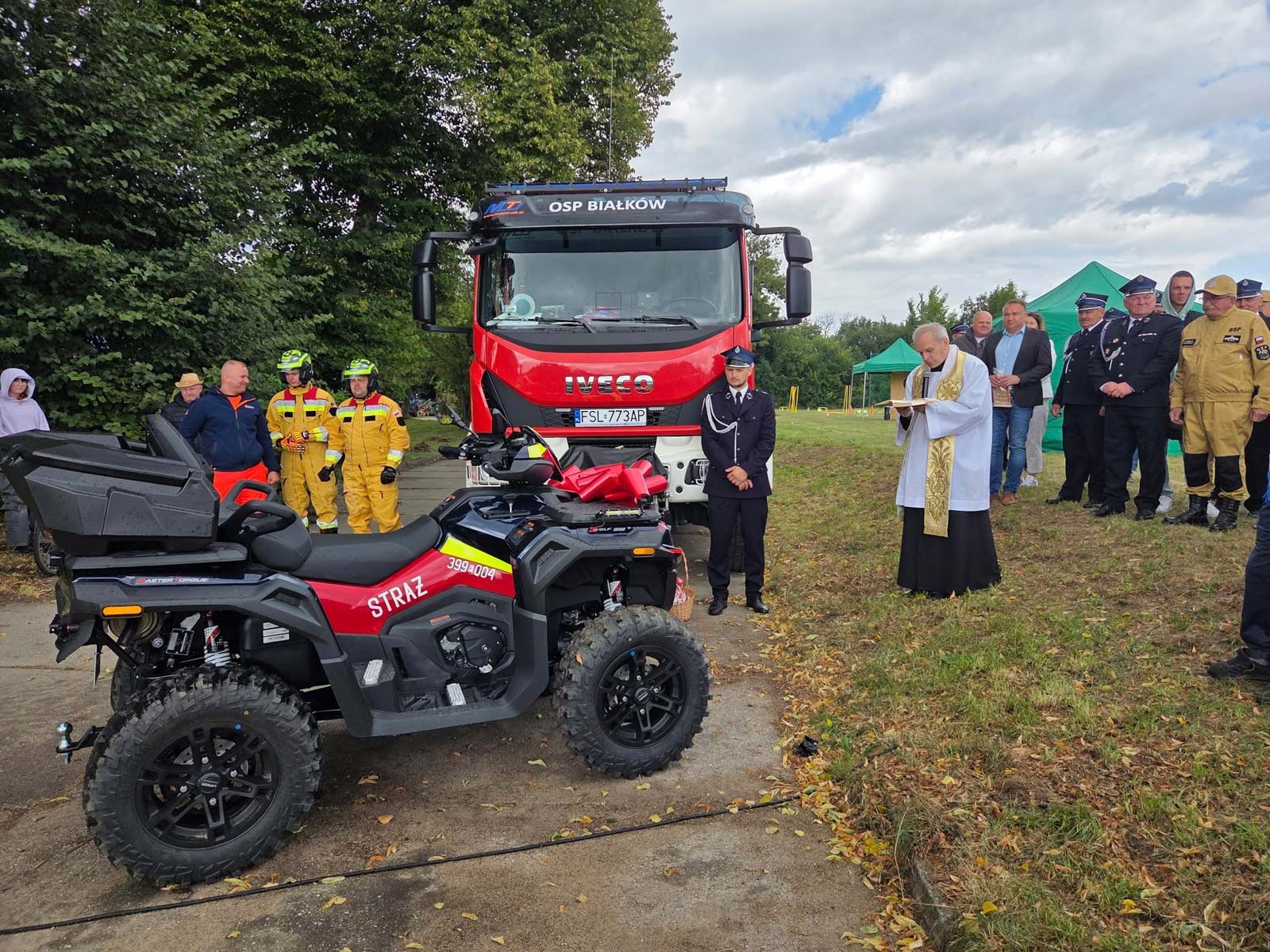 Kolejnym punktem programu było zaprezentowanie nowego pojazdu ratowniczego – quada Loncin XWolf 1000, który zasilił wyposażenie Ochotniczej Straży Pożarnej w Białkowie. Pojazd został poświęcony przez ks. proboszcza Krzysztofa Czekaja. O pozyskanie pojazdu druhowie zaczęli starać się już w lutym, biorąc udział w programie organizowanym przez Wojewódzki Fundusz Ochrony Środowiska i Gospodarki Wodnej w Zielonej Górze „Lubuski Strażak – wsparcie jednostek OSP w 2025 roku”.