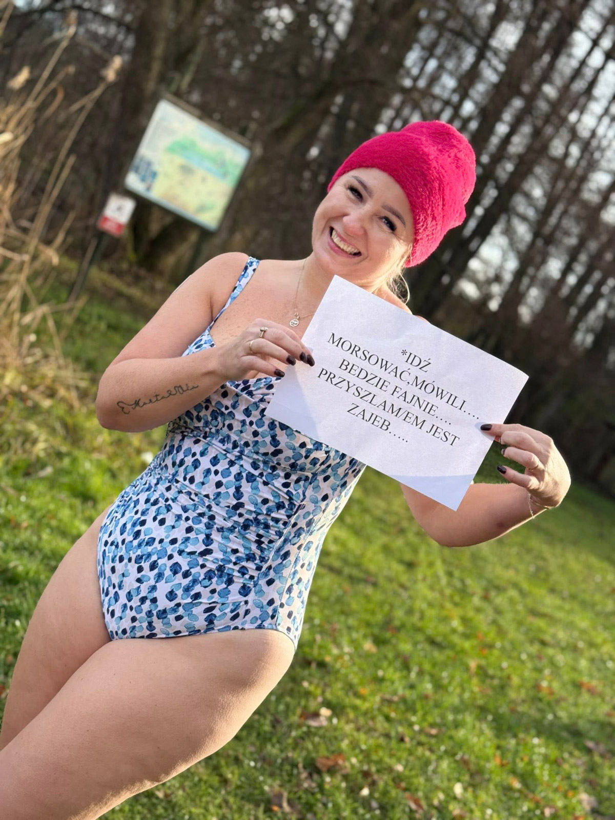 Na tabliczkach pojawiły się motywujące hasła, jak „Bo chcę więcej od życia” czy „Moja siła rośnie, gdzie inni się poddają”, ale nie zabrakło też tych z przymrużeniem oka. Wszystko w luźnej atmosferze, z dystansem i dużą dawką dobrej energii.