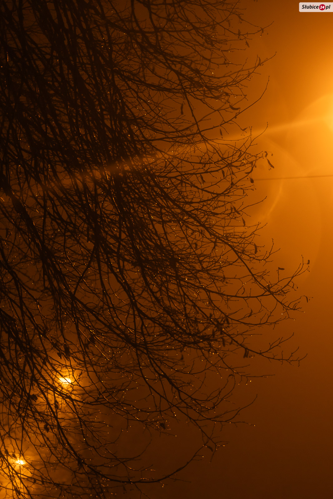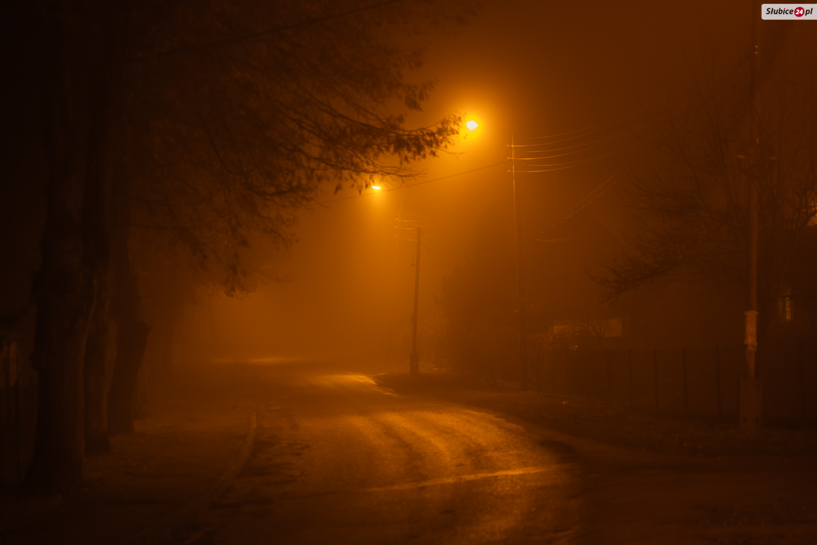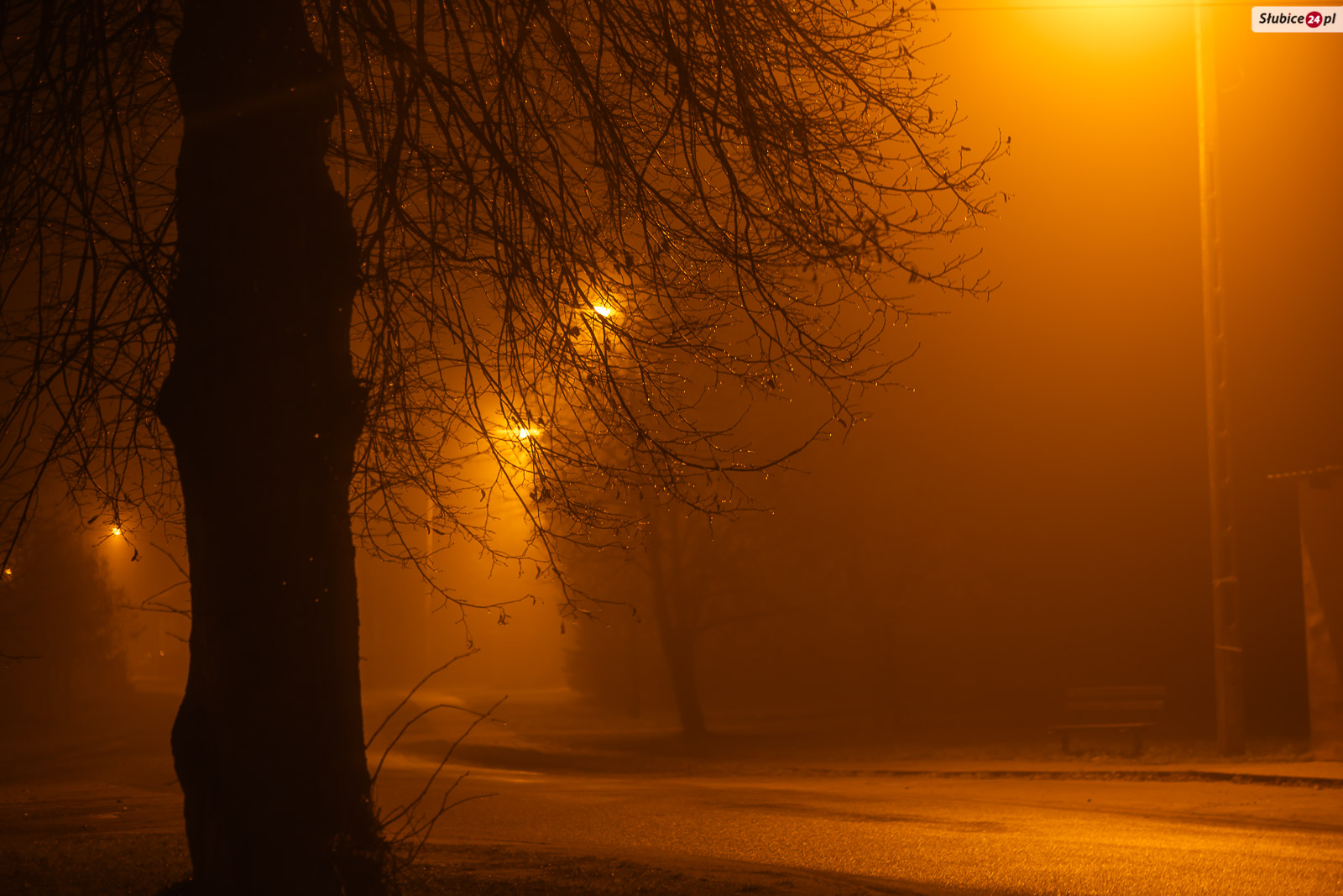 Tym razem odwiedziła Lubiechnię Wielką, gdzie tuż po zmroku mgła spowiła wiejskie uliczki i drzewa. A to wszystko oświetlone pomarańczowym światłem latarni.