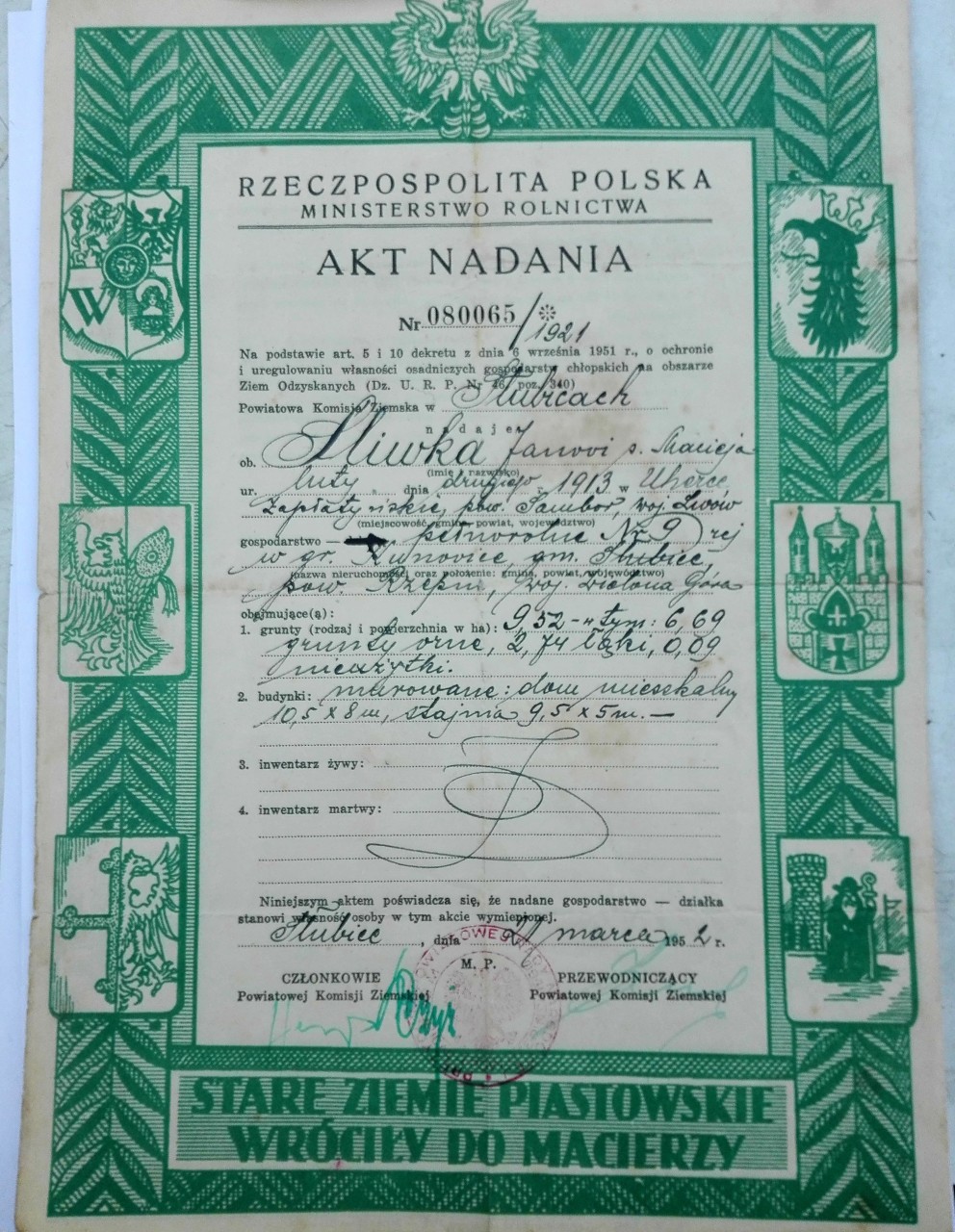 Ryc. 5. Akt nadania nr 080065, wydany 21 marca 1952 r. przez Powiatową Komisję Ziemską w Słubicach.