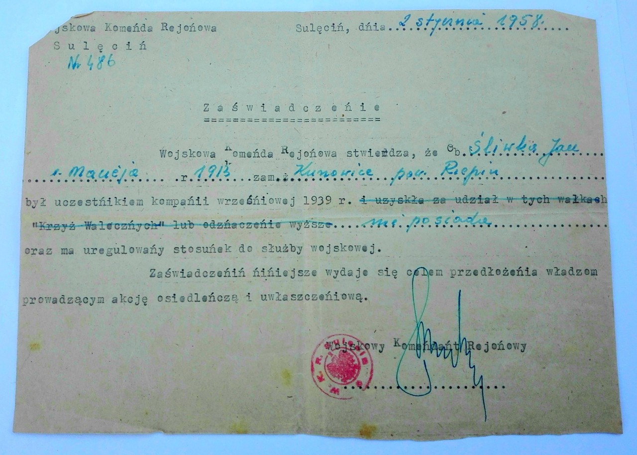 Ryc. 6. 2 stycznia 1958 r. Wojskowa Komenda Rejonowa w Sulęcinie wydała zaświadczenie nr 486, gdzie potwierdziła udział weterana Jana Śliwki (1913-1974) w wojnie obronnej Polski we wrześniu 1939 r.