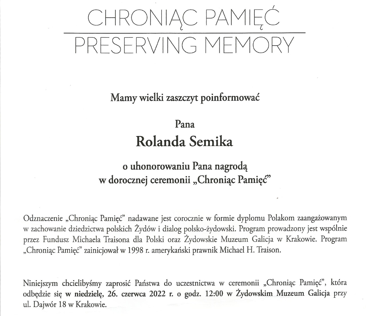 Roland Semik, regionalista i popularyzator lokalnej historii, redaktor naszego cyklu „Słubice wczoraj i dziś”, otrzymał odznaczenie „Chroniąc pamięć” podczas 31. Festiwalu Kultury Żydowskiej w Krakowie.