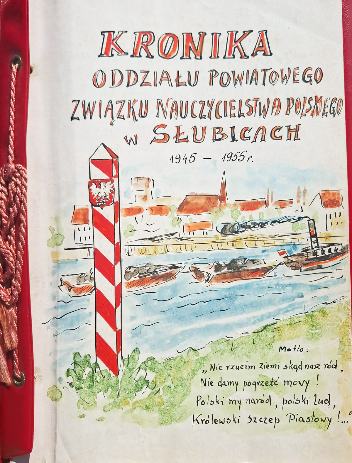 Prezentujemy dzisiaj zdjęcia pierwszych zapisków, które członkowie słubickiego ZNP zawarli w swojej kronice w 1945 roku. Księgę otwiera rysunek przedstawiający widok na Odrę i słup graniczny w biało-czerwonych barwach, a wpis zaczyna się od słów: „Koniec straszliwej wojny! Zwyciężyliśmy hitlerowskich ludobójców!”.