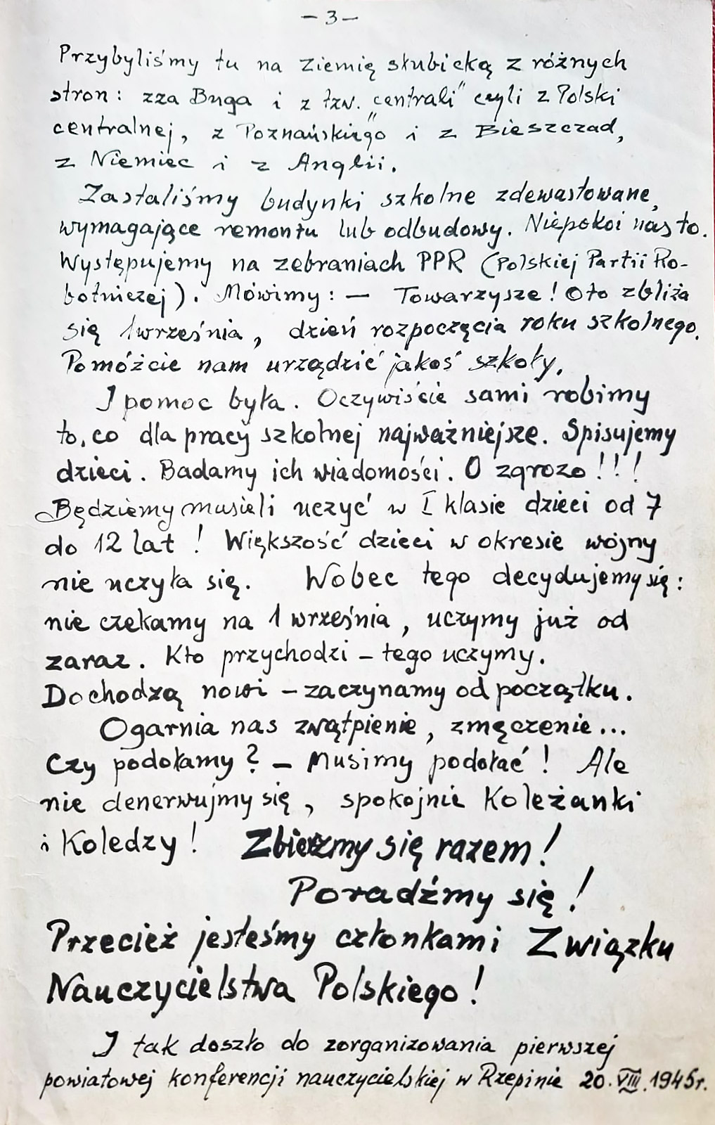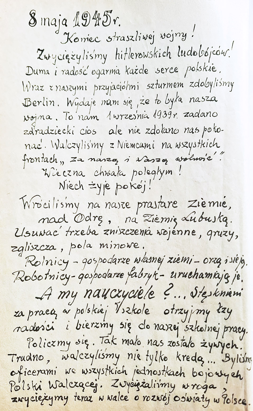 Kolejne wpisy są jeszcze bardziej poruszające. „Policzmy się. Tak mało nas zostało żywych. Trudno, walczyliśmy nie tylko kredą…”. Opis rzeczywistości, którą zastali nauczyciele, jest przygnębiający. „Usuwać trzeba zniszczenia wojenne, gruzy, zgliszcza, pola minowe”. Dalej czytamy: „Zastaliśmy budynki szkolne zdewastowane, wymagające remontu lub odbudowy”. Ale z poruszających i często smutnych słów przebijają się również słowa nadziei, że mimo zmęczenia i zwątpienia, nauczyciele "poradzą sobie".