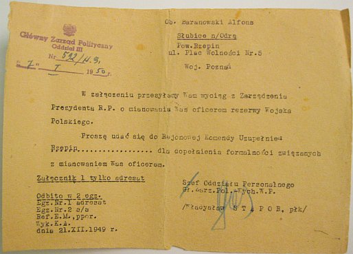 W styczniu 1950 r. płk Władysław Stąpor (szef Oddziału III Personalnego Głównego Zarządu Polityczno-Wychowawczego WP, wcześniej m.in. jeden z politruków w 2 Berlińskim Pułku Piechoty) poinformował Baranowskiego o zarządzeniu Prezydenta RP Bolesława Bieruta o mianowaniu go oficerem rezerwy WP. W celu dopełnienia formalności Baranowski został poproszony o kontakt z Rejonową Komendą Uzupełnień (RKU) w Rzepinie.