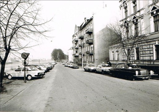 Zdjęcie nr 5. Widok na ul. Nadodrzańską, wówczas ul. Wilhelma Piecka, w kierunku północnym. Od lewej widać zachodnią fasadę domu przy ul. Jedności Robotniczej 1 oraz kamienice przy ul. Nadodrzańskiej 1 i 2.