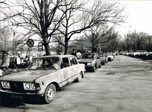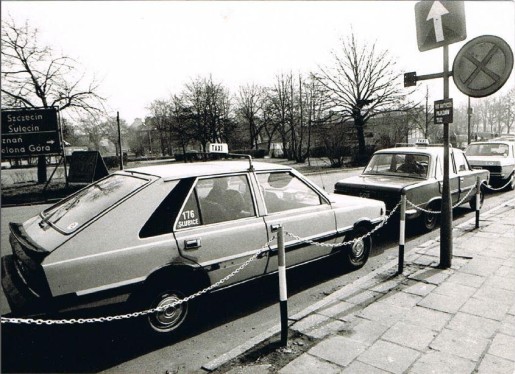 Zdjęcie nr 8. Jeden z postojów taxi w Słubicach okresu transformacji ustrojowej. Na podstawie starych fotografii można zauważyć dominację marek, tj. Fiat, Polonez i Mercedes.