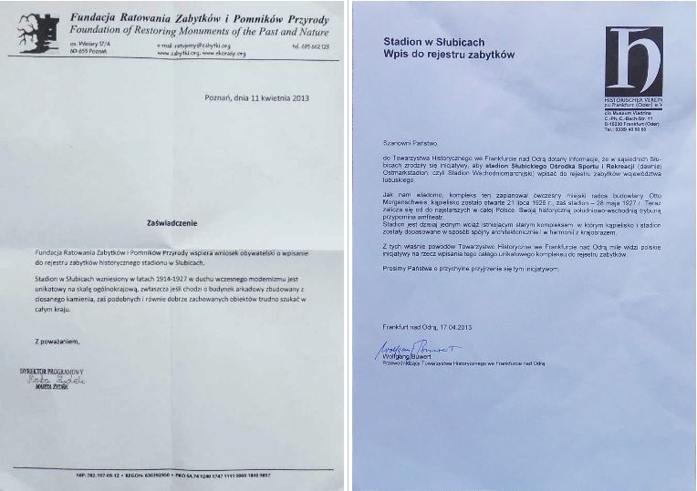 Ryc. 1. Poparcie dla wpisu do rejestru zabytków od Fundacji Ratowania i Pomników Przyrody w Poznaniu oraz Towarzystwa Historycznego we Frankfurcie nad Odrą.
