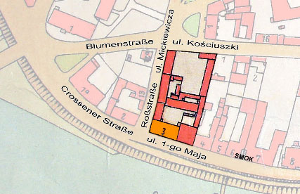 Adres Crossener Str. 3 był rozległy i obejmował nie tylko gościniec. Chodziło o grupę domów, które ciągnęły się przez Roßstraße, później ul. Mickiewicza aż do Blumenstraße, dzisiaj ul. Kościuszki. Pod tym adresem w 1857 r. frankfurcki budowniczy organów Wilhelm Sauer założył swoje przedsiębiorstwo a w budynku po prawej obok „Złotego Lwa“ swoją siedzibę miał też Urząd pocztowy Dammvorstadt. W tej grupie domów w 1941 r. zameldowanych było 27 gospodarstw domowych. Dzisiaj te działki oraz fragment ulicy pozostają zabudowane przez Collegium Polonicum.