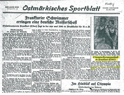 W archiwum miejskim we Frankfurcie nad Odrą w dodatku sportowym do gazety Frankfurter Oderzeitung z 20 lipca 1936 r. można przeczytać m.in. – cytat: „W najbliższą sobotę na Stadionie Wschodniomarchijskim we Frankfurcie nad Odrą wystartu-je wielu członków niemieckiej kadry olimpijskiej (...)“ i dalej: „Obok skoków do wody będą zawody w piłce wodnej młodzieży Frankfurtu przeciwko młodzieży Finsterwalde oraz drużyn seniorskich Frankfurtu iSenftenberg“. Koniec cytatu.